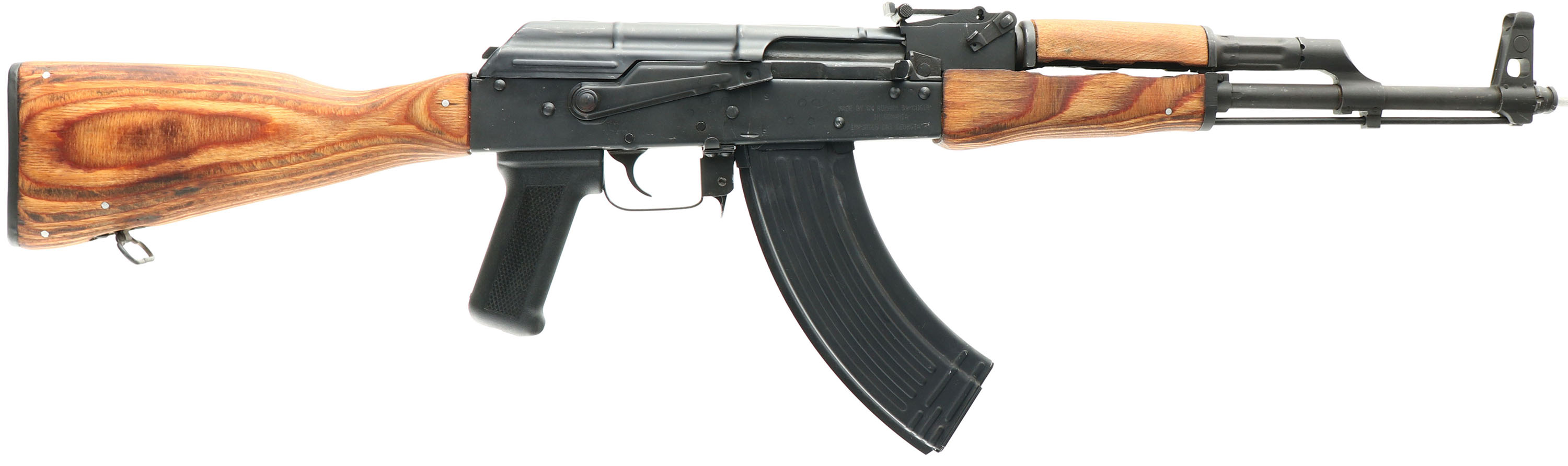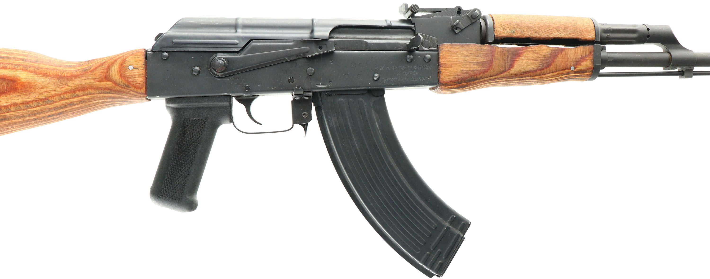 CN Romarm SA (Cugir Arms Factory in Romania) CAI import, Model: GP-WASR-10/63, Cal: 7.62x39mm. MFG: 1986 (parts kit date), S/N: SBO-0362-86, Semi-auto Rifle, 16 '' barrel. These rifles were made in Romania in a sporter configuration (Single stack mag wells, bores not fully rifled/bored, & alternate stock sets, Etc). CAI Re-configured them when they were imported to the classic AK Look. Some of the modifications appear rough but the rifle is fully functionable. The Laminated wood stock set is excellent with only light handling wear, the wood is unfinished. The black phosphate finish rates 90% with light scuffs, scratches & wear. The left side of the receiver is marked with the model & caliber, the right side is marked with MFG & import info. Left side of the receiver has a Russian optic mount. It has a Tapco Hammer & trigger, single stage trigger with Approx. 4lbs Pull. The bore is very good. Its bright with spots of light roughness in the grooves. Chrome lined bore. The muzzle device is spot welded into place. The barrel holds a post front sight with protective wings. Rear sight is a Tangent U-notch marked 1 to 10 with a rear battle Zero marked ''P''. The buttstock carries a steel trapdoor buttplate, nothing inside the stock. Rifle has a cleaning rod, & comes with one 30rd Mag. FFL Req. - Value: 600 to 1200