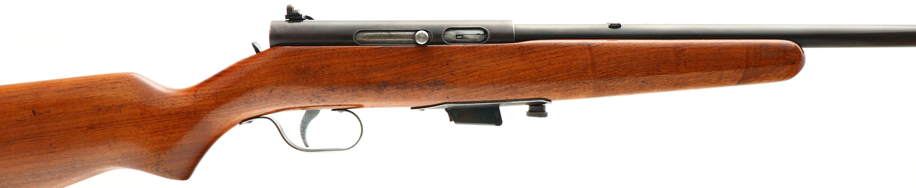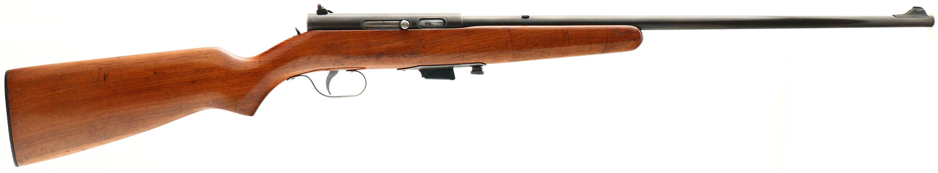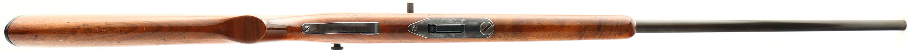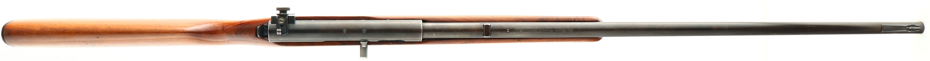 Marlin, Model 50 Versioin 3, CAL: 22 LR. Only, MFG: 1931-35, SN: NONE, Semi Auto Rifle, 24'' barrel. The original flat pistol grip wood stock is very good, but with several minor scrapes, scratches & contusions. The stock's finish is a combo of the original & a thin added layer of finish. The metal blue finishes rate 40% overall, with areas of loss developing a thin brown patina. Bore is excellent. The back of the receiver carries a side mounted receiver sight , while the barrel carries a blank filled rear dovetail & original blade front sight. The left side of the receiver has four open holes from previous scope mount, while the top of the receiver & top of the barrel each have two screw filled holes from previous scope mounting. The stock carries a serrated plastic buttplate. Detachable mag. FFL or C&R Req. - Value: 100 to 200