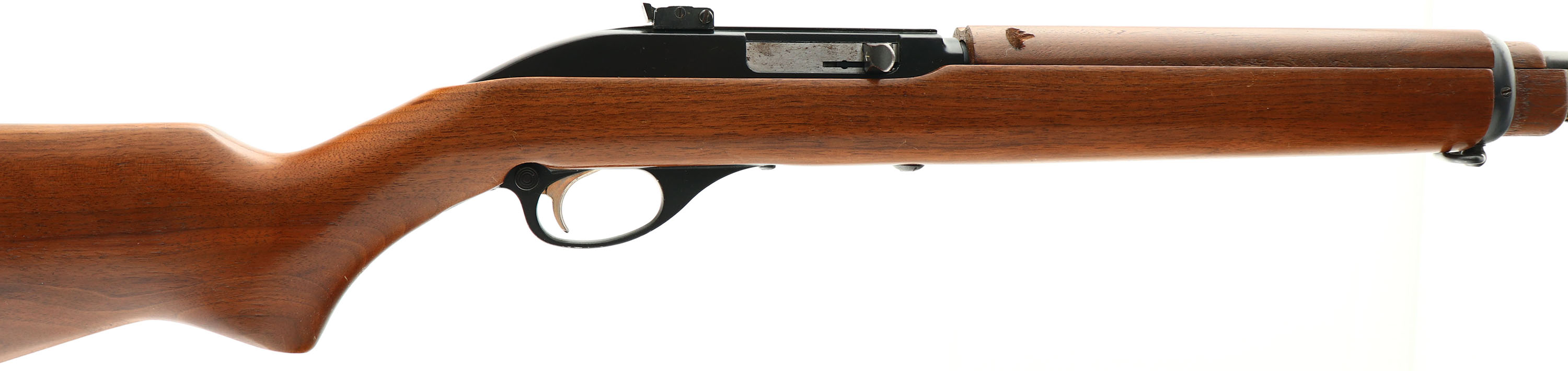 Marlin Model 99 M1, CAL: 22 LR, MFG: 1966-79, SN: 71522499, Semi Auto Rifle, 18'' barrel. Mag tube fed. The 99 M! is a model 99 with the wood stock styling of the famous M1. The original flat pistol grip stock & heat shield are excellent, displaying the original finish & a few minor nicks,scrapes & dings. The metal blue finishes rates 97% overall, The micro grooved bore is excellent. Receiver holds an adjustable rear sight & ramp/blade front sight. Buttstock carries a factory Marlin, black checkered buttplate. Sling swivels. Marlin trademark Bullseye in stock. Gold tone trigger. FFL Req. - Value: 250 to 400