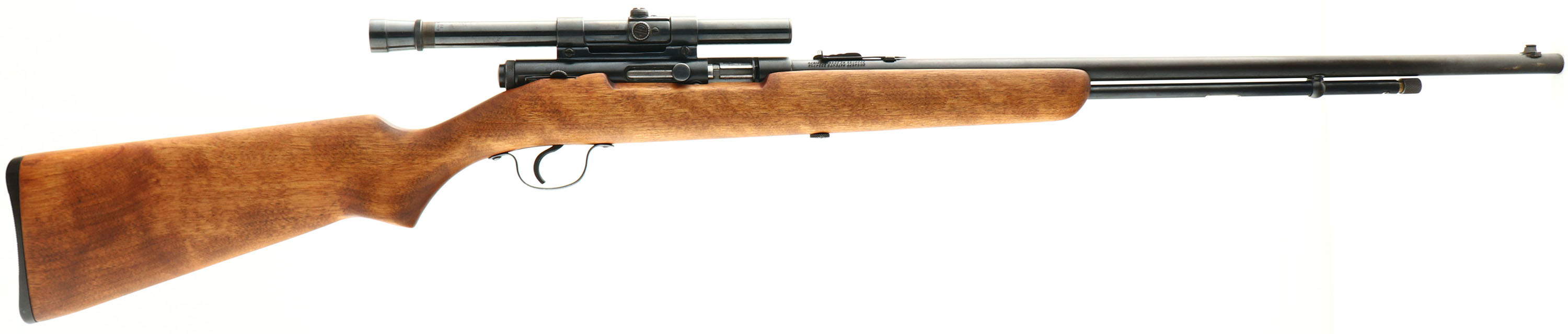 Stevens (Savage), Model 87C, CAL: 22 S.L.LR, MFG: 1949-67, SN: NSN, Semi Auto Rifle, 24'' barrel. The original flat pistol grip wood stock is excellent, with very few use marks. The metal blue finish on the barrel rates 85%, 90% on the receiver & mag tube, with the tube having the name ''John Coffey'' etched into the left side between the stock & cartridge opening. Bore is excellent. The receiver carries a Weaver scope, held by a Weaver .22 Tip Off scope mount. The barrel holds an adjustable rear sight & blade front sight. Stock carries a grooved plastic buttplate. FFL or C&R Req. - Value: 150 to 300