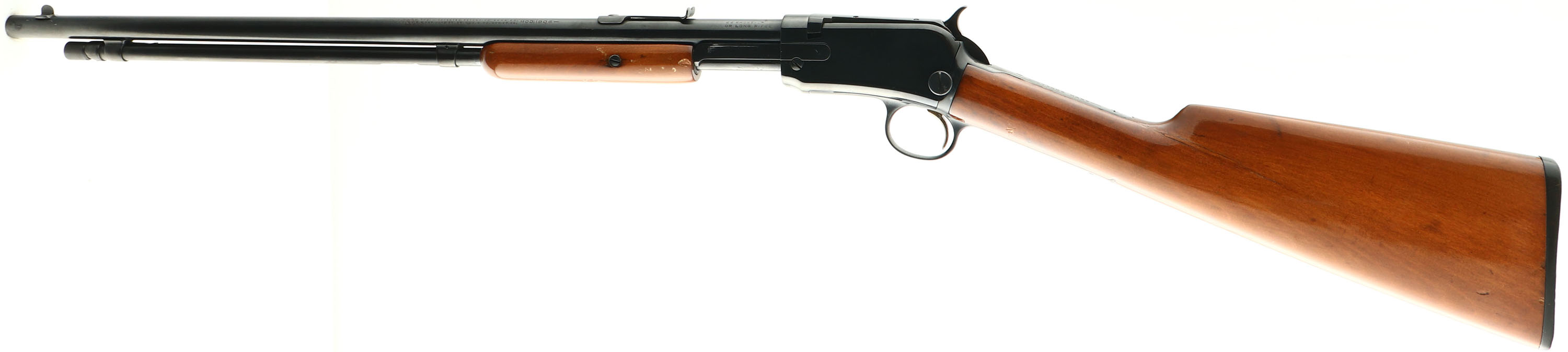 Winchester, Model 1906, .22 S. L. LR., MFG. 1910, SN: 225108, Take-down Pump Action Rifle, 20'' round barrel. This rifle has been fully refinished. The original wood stocks are very good, having been sanded & refinished. There is a 4'' tightly repaired hairline crack emanating from the upper tang & running back along the comb There are other minor blemishes & contusions to the high gloss finish. The reblued metal finish rates 95% overall, with some light speckling. Bore is fair, with cleaned roughness amongst worn rifling. Standard rear & front sights, with rear missing the elevation screw. Stock carries a Winchester plastic buttplate. FFL or C&R Req. - Value: 300 to 500