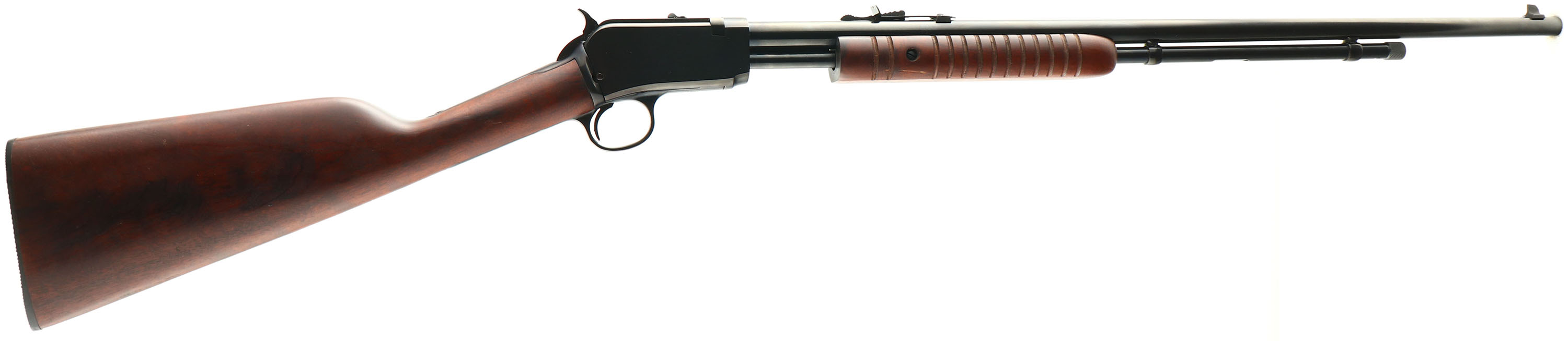 Taurus Model 62, marked .22 L.R., MFG. Modern, SN:TD3912, Pump Action Rifle, 23'' round barrel. Taurus' modern version of the famous Winchester model 62 rifle. The original straight grip wood stocks are excellent, with a couple of very minor contusions or surface blemishes to the original factory finish. The original metal blue finish is 99% overall. Bore is excellent. Barrel fitted with factory sights. Original checkered plastic buttplate. The forearm is the larger corncob style. An excellent original example. FFL Req. - Value: 200 to 300