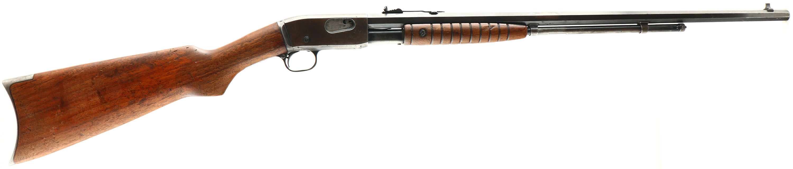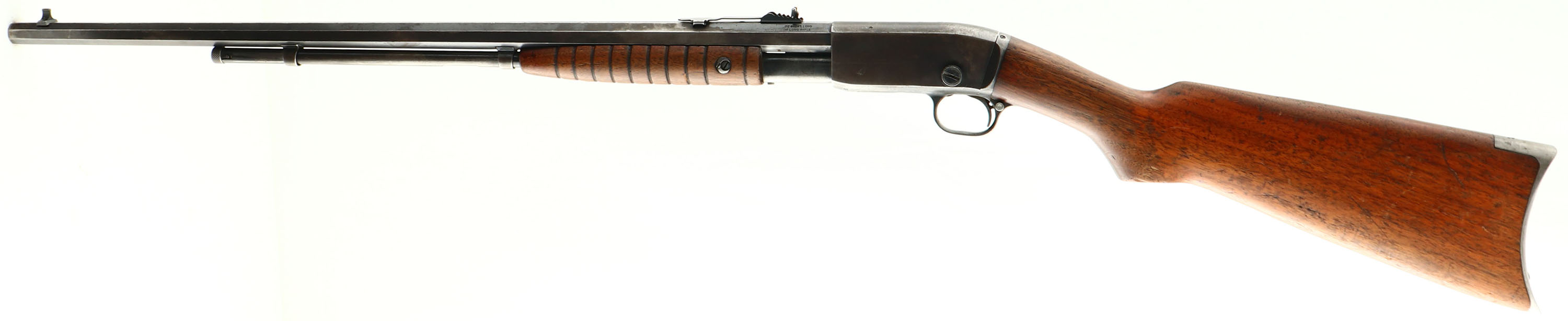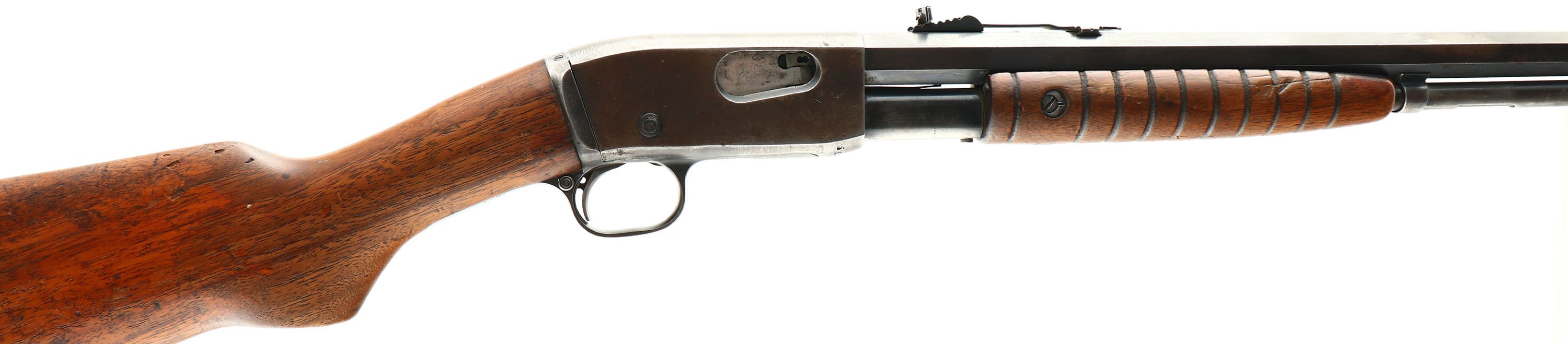 Remington, Model 12C, .22 S. L. & LR., MFG. 1909-36, SN: 513516, Pump Rifle, Take-down, 24'' Octagon barrel. The original flat pistol grip wood stocks are very good, however much of the original finish has worn away or thinned. There are numerous minor handling marks, scratches & contusions consistent with honest use. The orignal metal blue finish rates 60% on the barrel, 30% on the receiver & mag tube, with the balance worn mostly gun metal gray & a thin brown patina. Fitted with updated adjustable rear & tall blade front sights. There are two open holes on the top of the receiver & two more under the rear sight from previuos scope mounting. Bore is fair, with cleaned roughness & pitting amongst worn rifling. Original crescent metal buttplate. FFL or C&R Req. - Value: 200 to 400