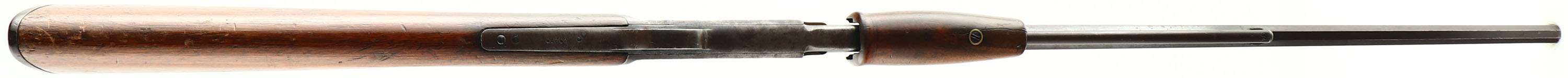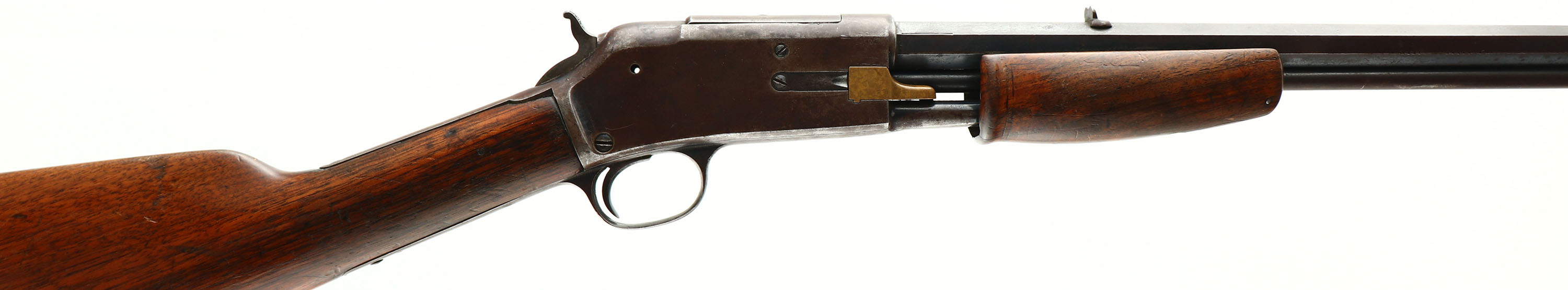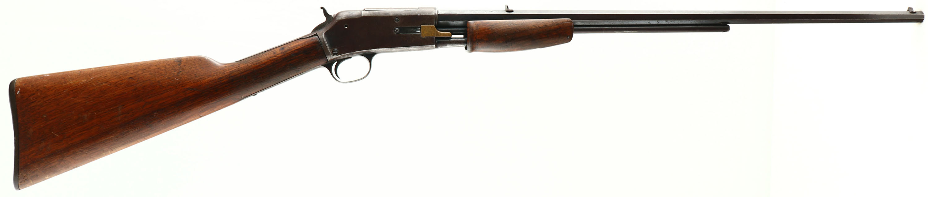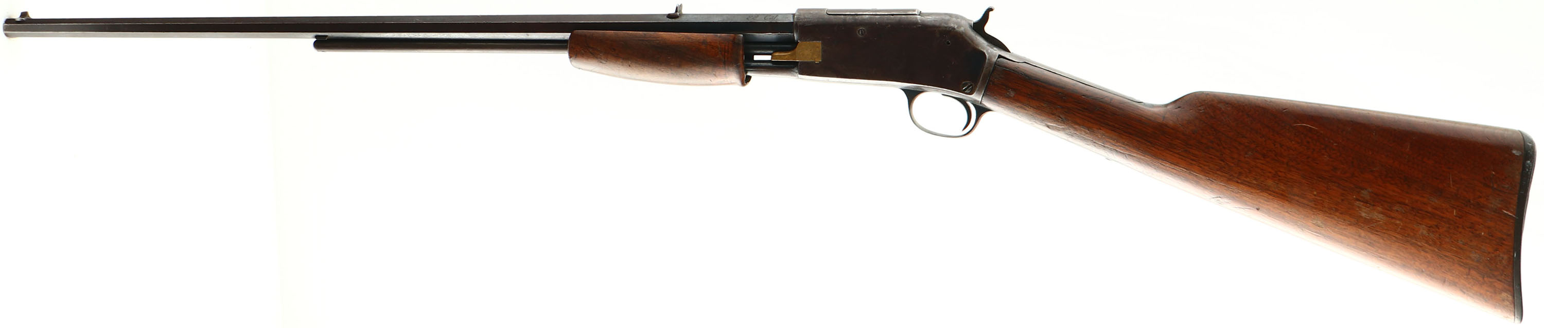 Colt Lightning Small Frame, CAL: 22, MFG: 1897 (Antique), SN: 29279, Pump Action Rifle, 24'' Tapered octagon barrel. The original straight grip wood stock & smooth forend are good & solid. The stocks were previously sanded & refinished long ago, & have received numerous minor scratches, contusions & scrapes since. 1'' crack on left side of wrist & & tiny pin at right side of wrist. The forend has a pin stabilized 2'' crack fron the tip to the forend screw. The metal blue finish has aged to a chocolate brown patina, with some areas worn gun metal gray & other areas protecting remnants of original blue. Bore is fair, with cleaned roughness & pitting amongst worn rifling. The barrel holds a fixed V-notch rear sight & small blade front sight. Buttstock carries a Colt marked checkered hard rubber buttplate. A surviving example of an antique early pump .22 rifle. Antique, No FFL Req. - Value: 800 to 1600