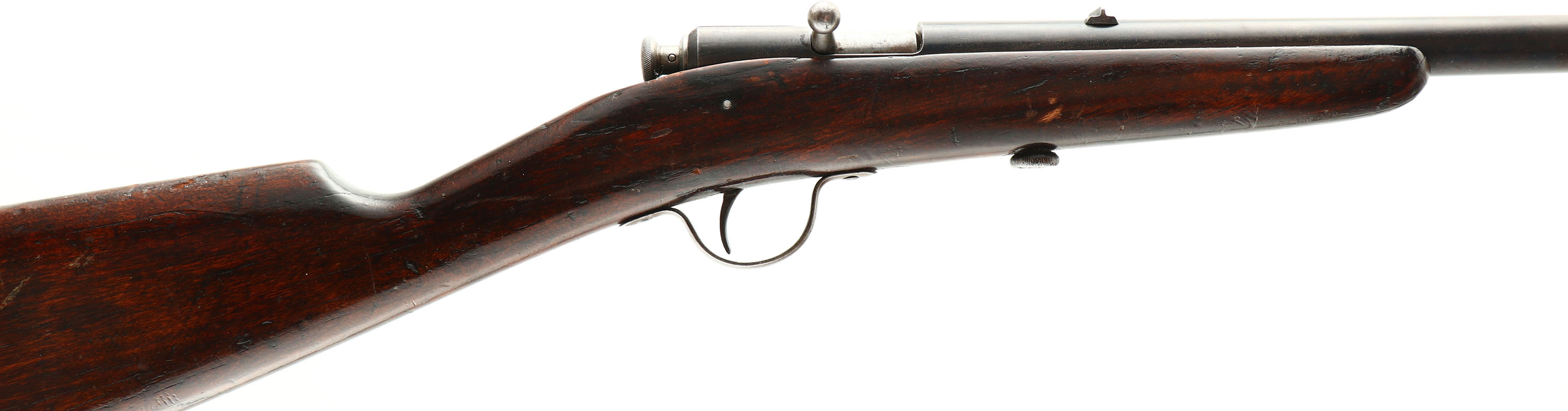 Winchester, Model 1900, CAL: .22 SHORT& LONG, MFG: 1900, SN: NONE, Bolt Action Rifle, 18'' Round tapered barrel. This is the early variation without the model # stamped on barrel. The original wood stock is good, with numerous small contusions, gouges & scrapes. The original finish has darkened with age & use, & it carries an additional layer of finish. There are a couple of hariline cracks coming off the buttend. The original metal blue finish has worn thin, with about 40% remaininig. The bore is good, with spots of cleaned pitting & corrosion amongst thinning rifling. Barrel carries a small fixed rear & small blade front sights. Buttstock carries no buttplate, which is correct for this model. Collectible early production variation. FFL or C&R Req. - Value: 200 to 400