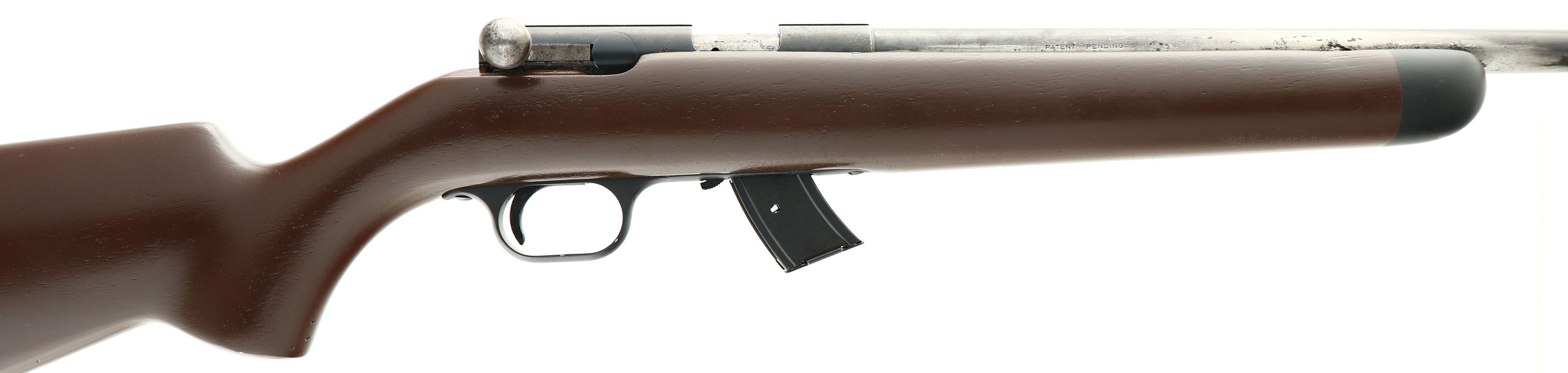 Browning, Model T-bolt, .22 Long Rifle Cal., MFG. 1966, SN: 24817X6, Bolt Action Rifle, 22'' round barrel. Belgian proof stampings on bolt, barrel & receiver. The original flat pistol grip wood stock is excellent, having been very nicely painted with a chocolate brown paint & black forend tip. There remains some minor dings or contusions under the current paint. The metal blue finish rates 50%, with an area mid barrel polished silver while cleaning an area of pitting. Bore is very good. Grooved receiver for future scope mounting. No rear sight provision & an open front dovetail. Detachable mag. FFL & C&R Req. - Value: 200 to 400