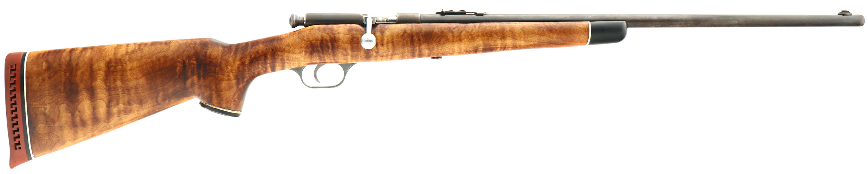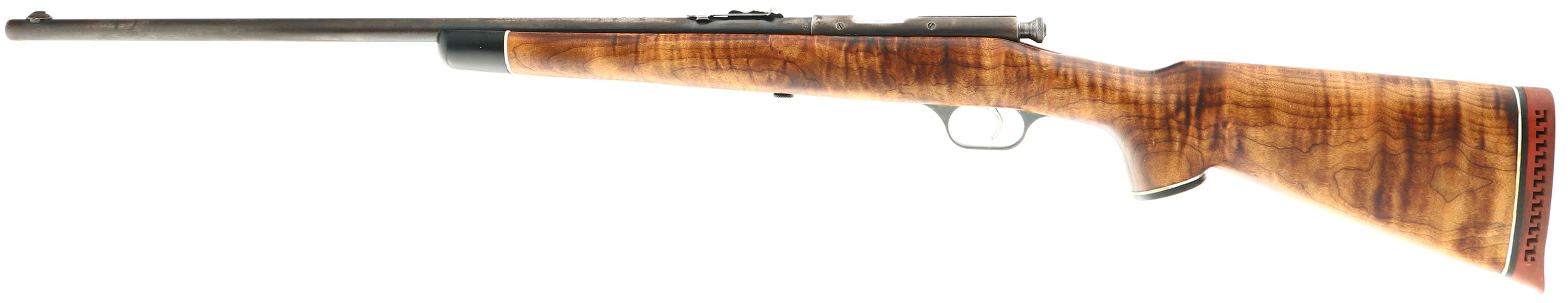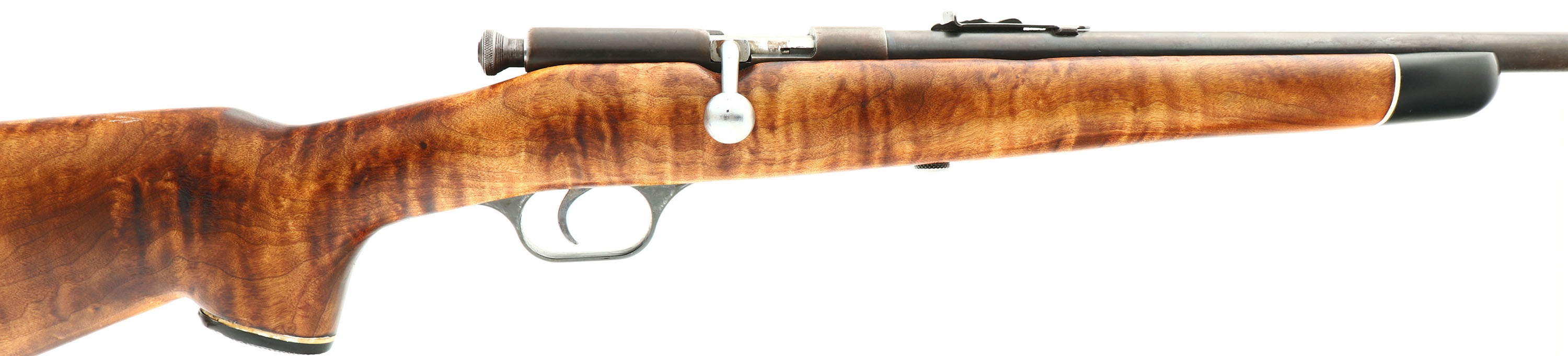 Springfield (J. Stevens Arms Co.), Model 83, .22 S, L, LR Cal., MFG. 1935-38, SN: None, Bolt Action Single Shot Rifle, 24'' round barrel. The capped pistol grip wood stock is a replacement, which rates very good. The stock has a white-line buttend, pistol grip cap & black tip forend. The stock has been sanded & very nicely refinished, with rippled grain & tiger stripped cross grain. There a very few minor scrapes contusions. The original metal blue finish rates 30% on the barrel, with the balance on the barrel & receiver toned to a brown patina, with some speckling. Bore is very good & bright. The barrel caries an adjustable rear & front blade sight. The receiver & barrel each have two empty holes from previous scope mount. The stock carries a period ventilated recoil pad. Nickeled bolt, bolt handle & trigger. FFL or C&R - Value: 150 to 300