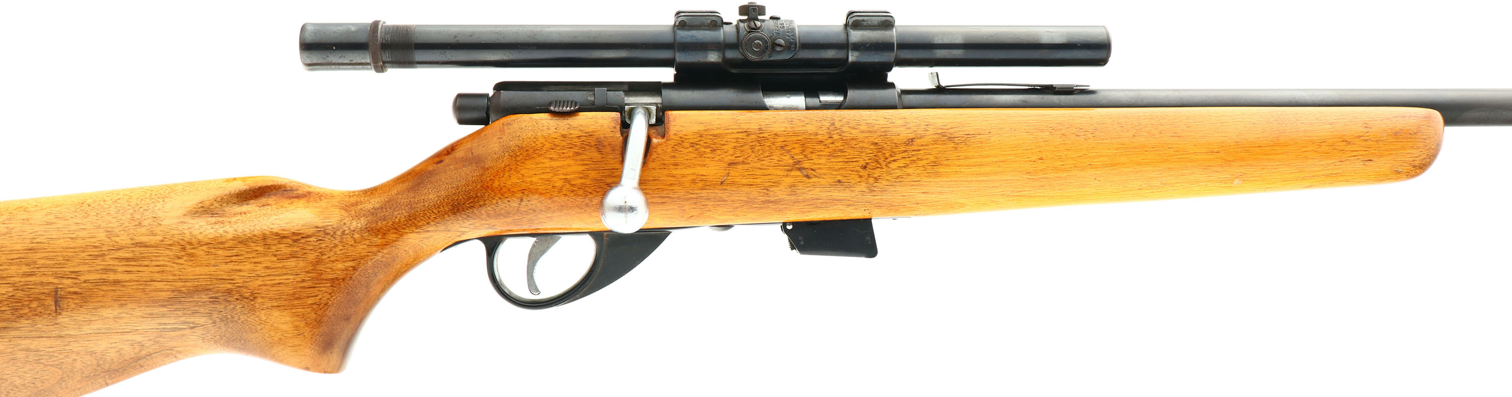 J.C. Higgins (Sears), Model 103 16 (Marlin 80), Marked .22 S, L, LR Cal., MFG. 1946-62, SN: None, Bolt Action Rifle, 24'' round barrel. The original flat pistol grip wood stock is excellent, having been lightly sanded & refinished. There remains several minor scrapes, scratches & contusions. The original metal blue finish rates 85% overall. The bore is excellent & bright. The receiver is mounted with a Weaver G6 small bore scope on a N2 mount, while the barrel carries an adjustable rear missing the elevator & front blade sights. The stock carries the original plastic buttplate. Detachable mag. Nickeled bolt, bolt handle & trigger. FFL or C&R Req. - Value: 150 to 300