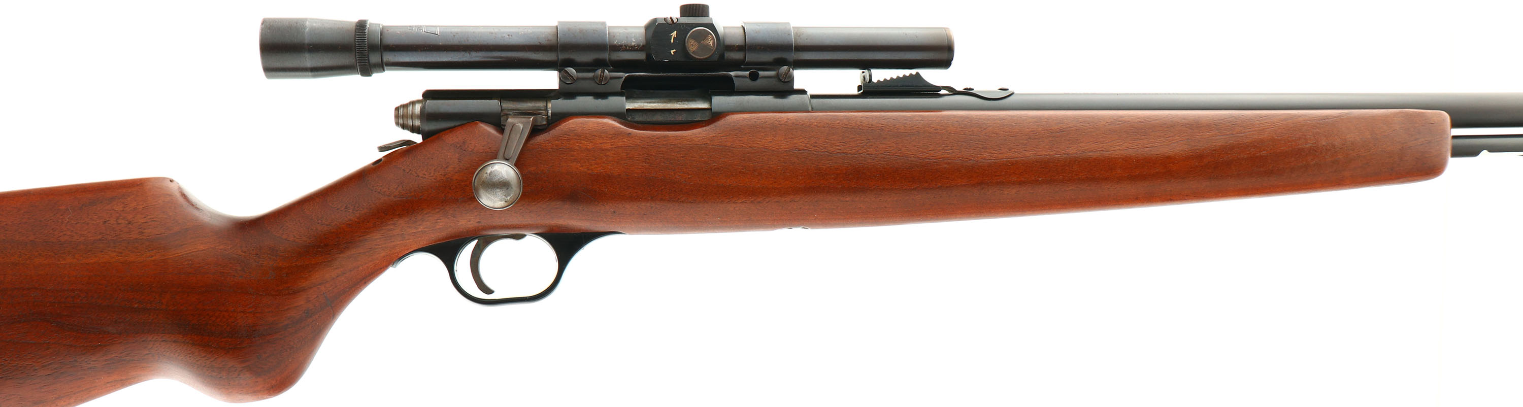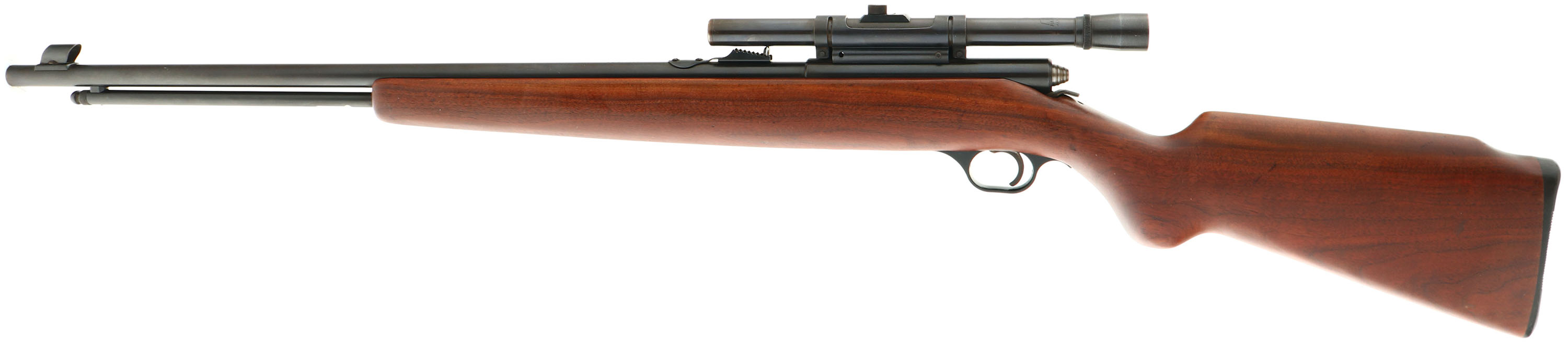 Hawthorne Warrior, Model M820B (Mossberg346), Marked .22 S, L, LR Cal., MFG. 1960-71, SN: None, Bolt Action Rifle, 24'' round barrel. Tubular mag. The originalround pistol grip Monte Carlo wood stock is very good, having been sanded & refinished. There remains a few minor finish handling marks to the finish. The original metal blue finish rates 90% overall. The bore is excellent & bright. The rifle is mounted with a Hawthorne 4X-1480 scope in the grooved receiver, while the barrel carries an adjustable rear & hooded front blade sights. The stock carries the original plastic buttplate. Missing the small plastic safety indicator buttons in the stock. Tubular mag. FFL or C&R Req. - Value: 150 to 250