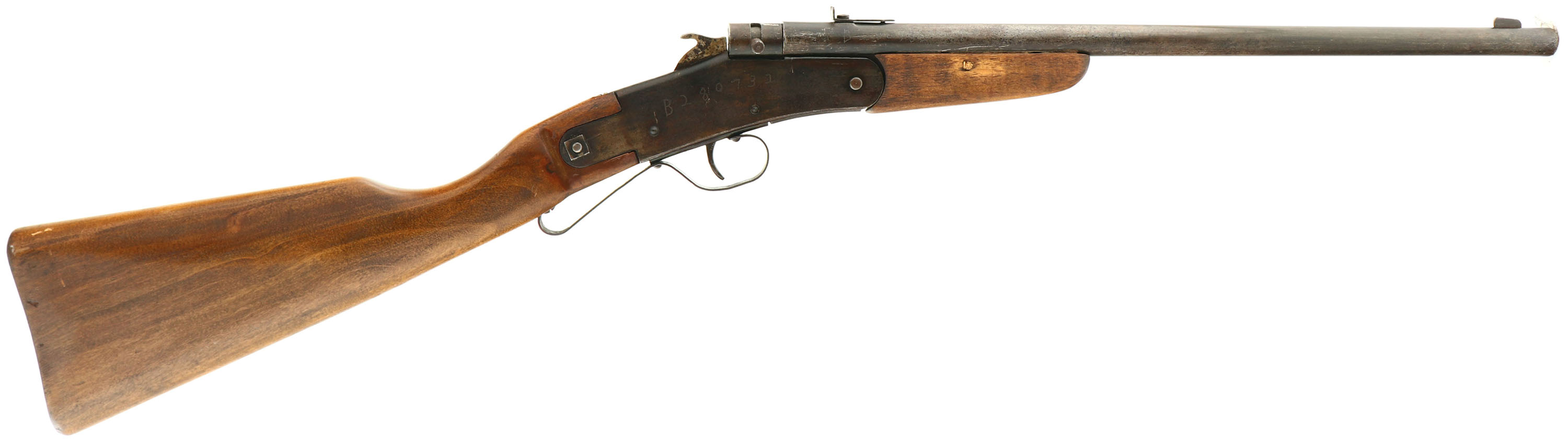 C.J. Hamilton & Son, Model The Hamilton Rifle No. 27 (USA produced version), .22 LR, MFG 1907-30, Single Shot, Tip-up Break Action Rifle, SN: none, 14 7/8'' round barrel. 29 1/2'' overall length. Circa 1906 through 1940's Cloverine Salve ran ads in comic books & newspapers asking kids to sell their salve & offering awards for the amount of product sold. The prizes include such pieces as this Hamilton rifle, a Red Ryder BB gun, toys & more. One of the first rifles offered in the Cloverine ads was the Hamilton Model 27 rifle. Other companies duplicated these award driven sales opportunities for kids selling magazines, seeds & other household items. The replaced flat board, straight grip, walnut stained birch stocks are very good & solid. The stock has a long area of fill behind the trigger guard. The stocks have a few minor of scratches & contusions to the very good finish. The metal has worn to a mix of gun metal gray & thin brown patina, with some remains of original blue mixed in. Some light pitting & speckling. The sides of the receiver & on the barrel have been electric pencil engraved with a 7 digit number. Receive screw & nut holding on the stock is a replacement. Steel rolled barrel over brass bore liner, 6 groove bore with 1 turn in 15''. Bore is good. Blade front & early rear sight combination. ''S'' shaped trigger guard, with replacement screw. No buttplate style. FFL or C&R Req. - Value: 50 to 150