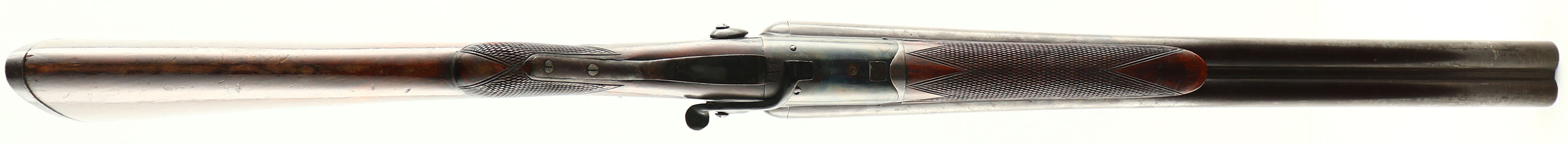 William Moore & Co., Bank/Coach Gun, CAL: 10GA, MFG: 1854-74, SN: NONE, Sidelever Break Action SxS Shotgun, 20'' Laminated Steel barrels. The side plates are marked ''Wm MOORE & CO''. The barrel rib is marked ''LAMINATED STEEL''. The original checkered round knob stock & forend are excellent. There are contusions, scratches, scrapes & thinning finish on the belly. There appears to be finish added at one point in time, possibly lightly sanded due to the buttplate being slightly oversized. There is no other evidence of being refinished. The browned finish on the laminted steel barrels is excellent. There are a couple small spots of scabbard or sheath wear on the sides of the barrels at the muzzle & chamber. The case-hardned frame & side plates retains excellent case-colors. The tang & right side plate were most likely handling points & have more wear than the other case-colored areas, exposing metal gray. There is a layer of laquer over top of the metal surfaces. Some companies were known to do this to help preserve the finishes. Bores are excellent. Brass bead front sight. Factory carved & checkered buttplate with multiple small cracks. Double triggers. Mechanically excellent. LOP: 13 3/4''. A high condition example of what is known as a ''Bank Gun''. Antique, No FFL Req. - Value: 1000 to 2000