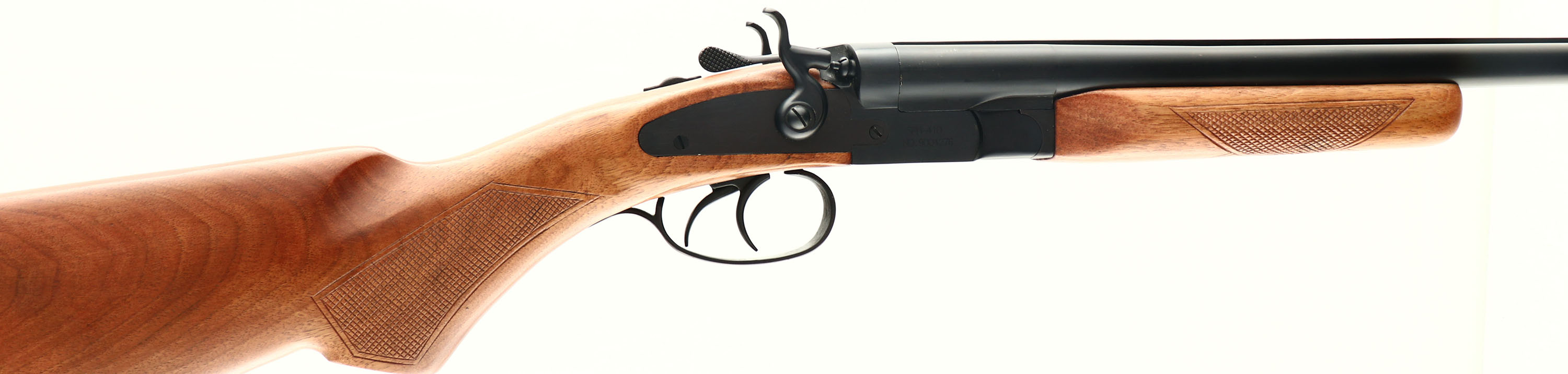 Jing (China), Model SPM-410, CAL: 410GA, MFG: Modern, SN: 9004276, Break Action SxS Shotgun, Choke: Cyl/3'' Chamber, 20'' barrels. Standard factory markings. The original checkered wood stocks are excellent. Blank sling stud provision in belly of stock. The original metal blue finish rates 97% overall. There are two blank screw holes in the bottom rib for sling stud. Bores are excellent. Solid rib carries a bead front sight. Stock has solid black hard rubber recoil pad. LOP: 14 1/2''. FFL Req. - Value: 200 to 400