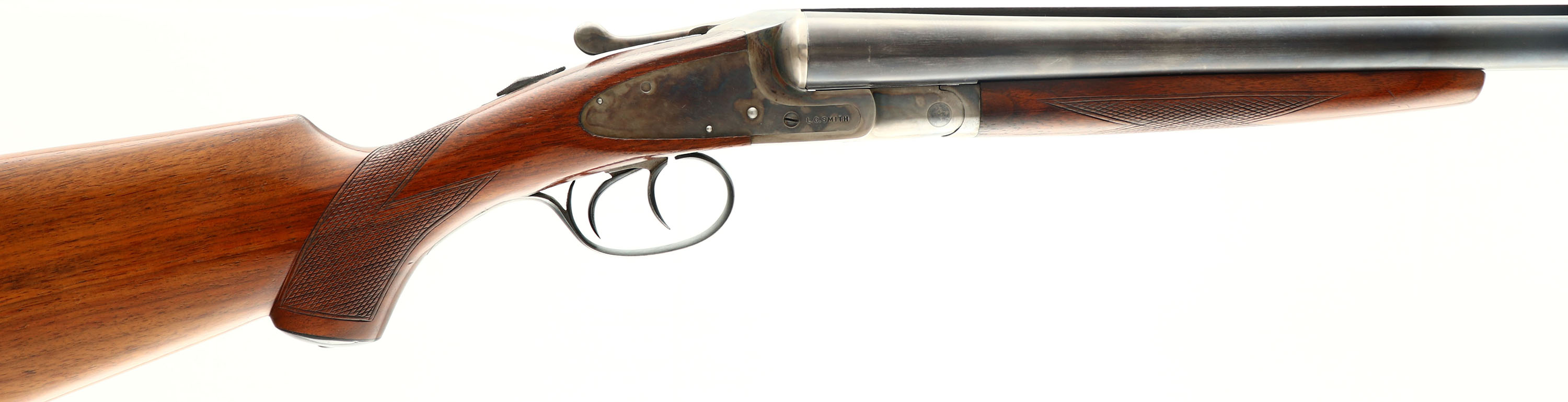L.C. Smith, Field Grade, CAL: 12GA, MFG: 1945/46, SN: 205745, Break Action SxS Shotgun, Choke: F/MOD,30'' barrels. Standard factory markings on the frame & barrel. The original checkered flat pistol grip stock is excellent. The original finish is excellent. The original blued finish on the barrel rates 80-85% coverage, with thinning at the carry/handling points. The case-hardened frame retains nice case-colors, with concentrated wear to the bottom of the frame (carry point). Bores are excellent. The solid matted rib holds single front bead. Stock carries a grooved plastic buttplate. LOP: 14 1/8'', DAH: 2 1/3'', DAC: 1 3/8''. An excellent example of a late war-time/ early post-war shotgun. FFL or C&R Req. - Value: 400 to 800