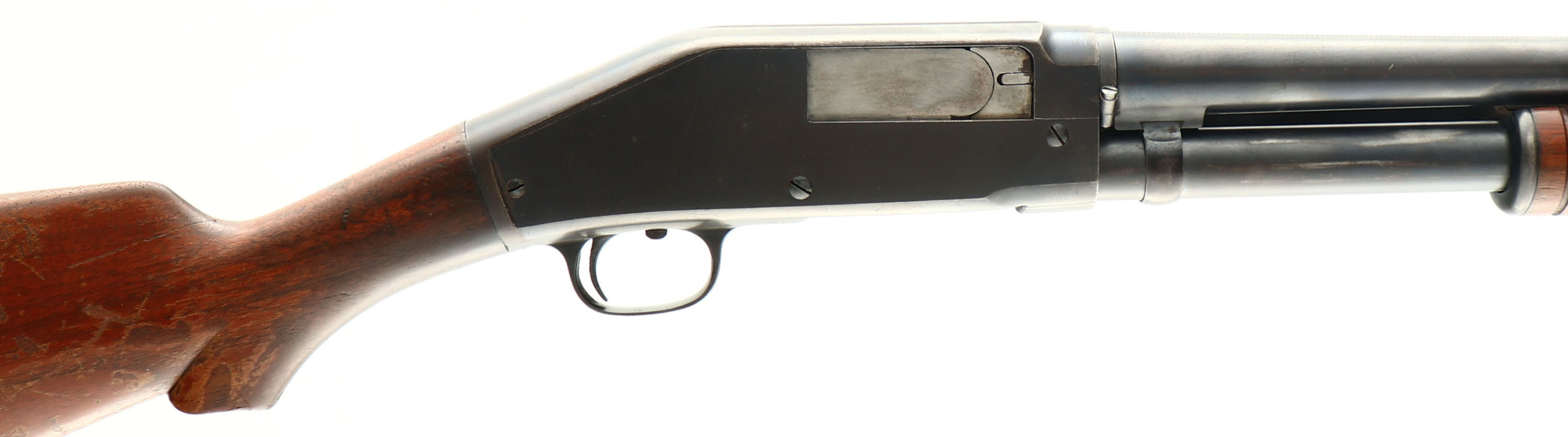 Marlin, Model 44, CAL: 20 GA, MFG: 1922-33, SN: 2291, Pump Action Shotgun, 28'' Matted barrel. The original scalloped pistol grip stock & corncob forend are very good & solid. The finish has flaking, thinning, scrapes, & scratches, with some darkening from oils & use. The blued finish rates 85% overall, with thinning toned to a brown patina. Bore is very good, with striations & visible light wear marks. The matted barrel holds a single front bead. Stock has a grooved plastic buttplate. Trademark bullseye in belly of the stock. LOP 12 3/4''. FFL or C&R Req. - Value: 150 to 250