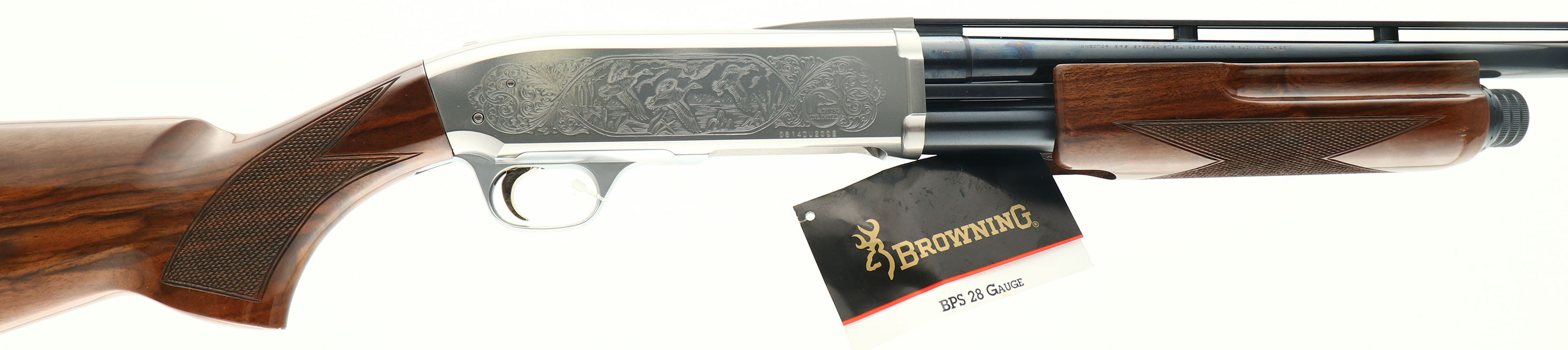 CASED Browning, Model BPS Engraved DU shotgun, 28 Ga., MFG. Modern, SN: 0814DU20021, Pump Action Shotgun, made in Japan, 26'' Matted Vent Rib barrel, take down, Interchangeable invertor choke tube system with all three chokes, 2 3/4'' shells, High grade walnut glossy checkered stocks are near Mint, with flat knob pistol grip, factory black butt plate, Metal blue is 100%, with distinctive silver engraved receiver that pictures Mallards setting in on both sides, Bore is mint, NIB, bright & shiny, Bottom eject (great for left or right handed shooters), Thumb safety, 14 1/8'' LOP, Comes with correct factory box with lock, wrench & paperwork, Here is your chance to buy a Mint 28 Gauge PBS that has been out of production for 23 yrs. FFL Req. - Value: 1000 to 2000