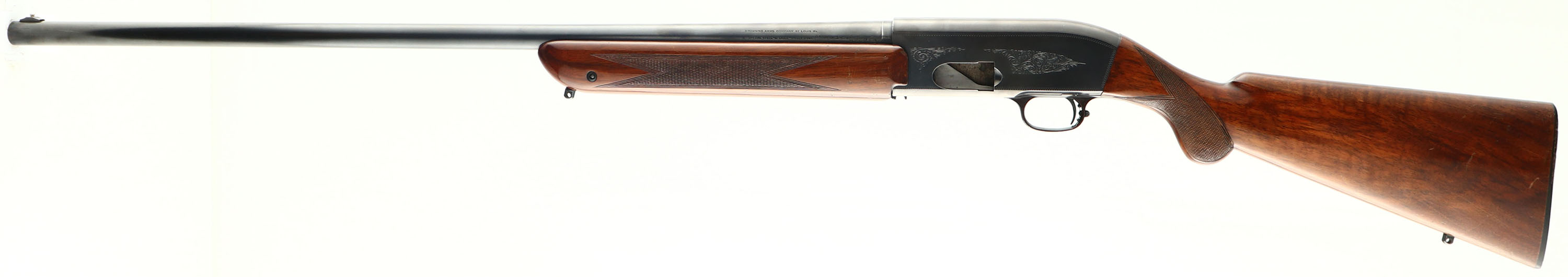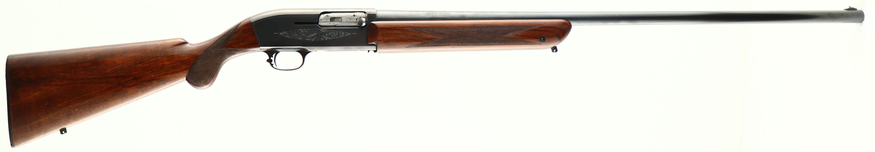Browning (Belgium), Model ''Twelvette'', CAL: 12 GA, MFG: 1955-71, SN: C11748, Double Automatic Shotgun, 29 1/2'' barrel. Full Choke, The original checkered round knob pistol grip wood stock & forend are excelelnt, with several minor to small scrapes or contusions to the high gloss finish. The original metal blue finish rates 95% overall. The receiver displays scroll hand engravings. Bore is excellent & bright. The barrel holds an elevated front bead. Buttstock carries the John Browning portrait plastic buttplate with very small chips to toe. Sling studs. Approximately 67,000 Double Autos were produced, so fairly limited production & becoming very collectible today. A very nice original example & collector grade. FFL or C&R Req. - Value: 1000 to 1500