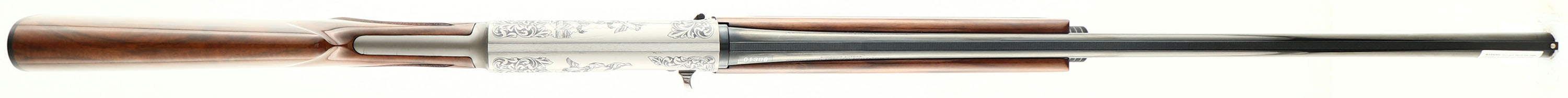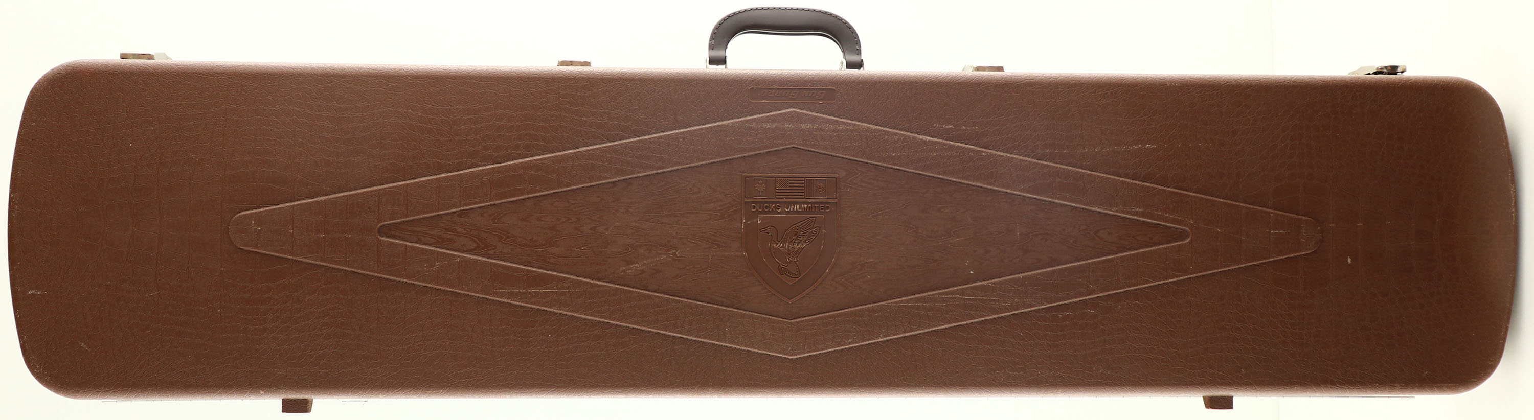 Cased Browning, Auto-5 Ducks Unlimited Light Twenty CAL: 20 GA, MFG: 1990, SN: 90DU001306, Semi-Auto Shotgun, Invector Choke System, 2 3/4'' chamber, 26'' Ventilated matted ribbed barrel. Ducks Unlimited Special Edition. The Miroku factories in Japan built 5,000 of these Auto-5's. Featuring elaborately engraved silver coin receiver & fancy checkered walnut stocks. The words ''DUCKS UNLIMITED'' & ''LIGHT TWENTY'' are engraved in banners across the sides of the receiver, along with numerous ducks in hunting scenes. Engraved trigger guard. Engraved & signed by T. NAGANOI. Both wood & metal finishes are as excellent. Bore is excellent. Barrel holds a single front bead. Buttstock carries Browning buttplate. Gold Trigger. Never shot. Has all choke tubes, wrench and paperwork, Sticker still on barrel. 14'' LOP. Excellent DU & Browning collectible.* FFL Req. - Value: 1400 to 2400
