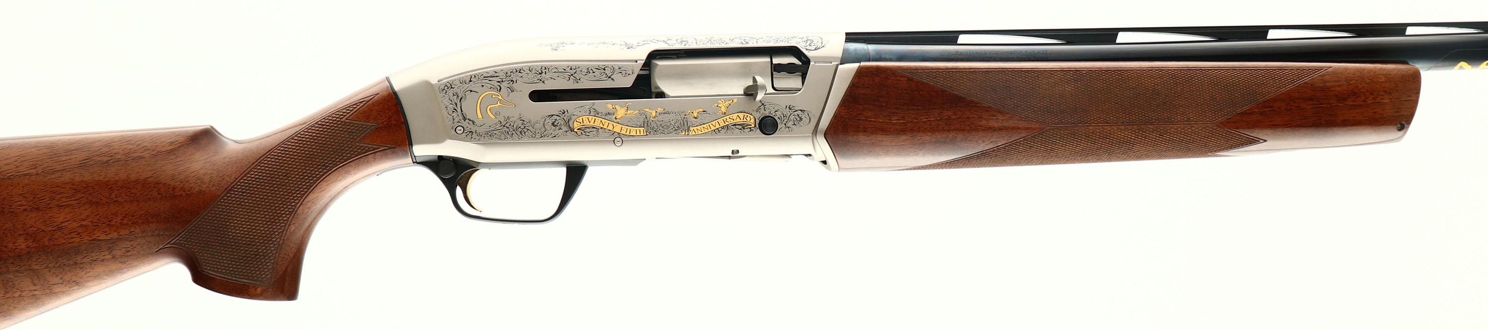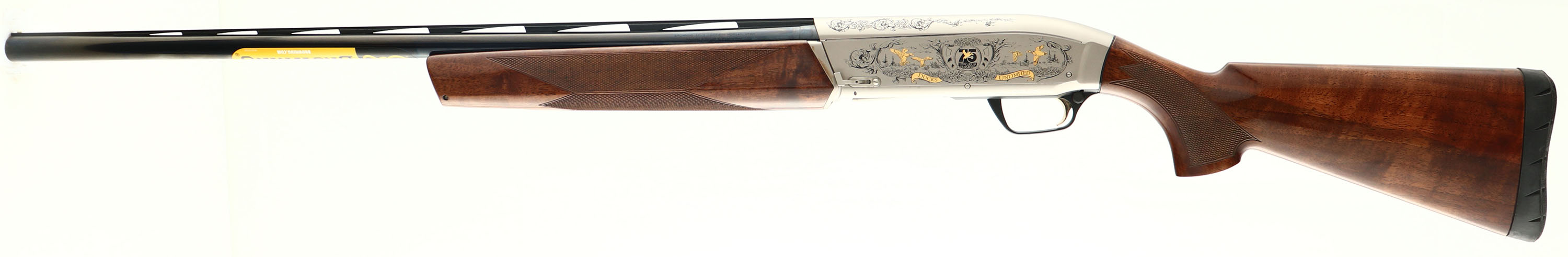 CASED Browning, Mazus Ducks Unlimited 75th Anniversary CAL: 12 GA, MFG: 2012, SN: 2012DU0242, Semi-Auto Shotgun, Choke: screw in Invector (all three), 2 3/4'' & 3'' chamber, 28'' Ventilated matted barrel. Ducks Unlimited 75th Anniversary Special Edition. Featuring elaborately engraved silver coin receiver & fancy checkered walnut stocks. The words ''SEVENTY FIFTH ANNIVERSARY'' & ''DUCKS UNLIMETED'' are engraved in banners across the bolt side of the receiver, along with numerous ducks in hunting scenes. Both wood & metal finishes are as ''NEW''. Bore is mint. Barrel holds a single front bead. Buttstock carries the original Factory recoil pad. Gold trigger. Never shot. Comes in original DU Gun Guard case, with Booklet, lock, paperwork & keys. LOP 14 1/4'' over pad. Excellent DU & Browning collectible.* FFL Req. - Value: 1600 to 2200