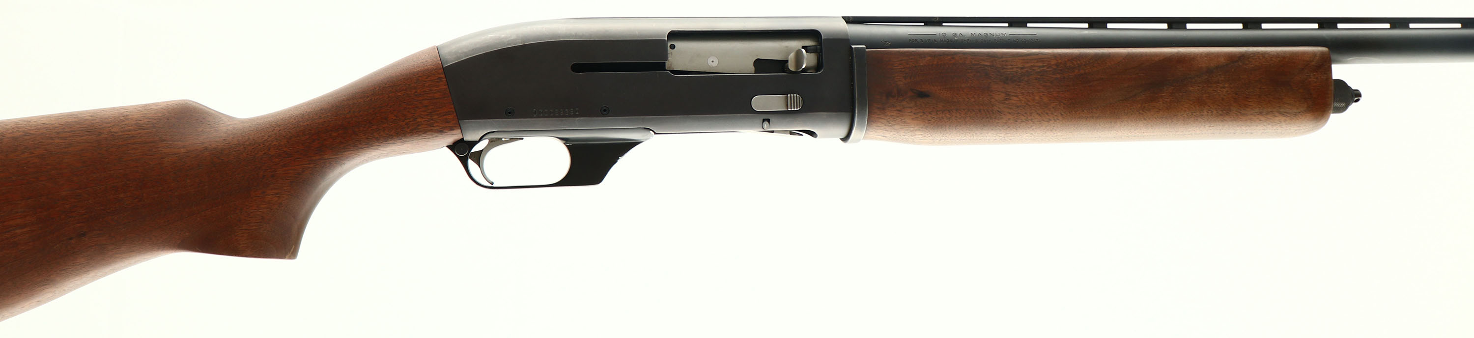 Ithaca, Model MAG-10, CAL: 10GA, MFG: 1974-86, SN: 100029390, Semi Auto Shotgun, 3 1/2'' MAG ONLY, 32'' ventilated rib barrel. The original capped pistol grip wood stocks are very good & solid. They display the original finish but thinning, almost no nicks & dings The original metal blue finish on the barrel rates 80%, the receiver is 50%. Bore is very good. The ventilated rib carries a single ivory front bead. Buttstock carries a factroy vent red recoil pad. Sling swivel studs, LOP: 14 3/8'', Weight: 11.9 lbs. A great goose or turkey gun. FFL Req. - Value: 400 to 800