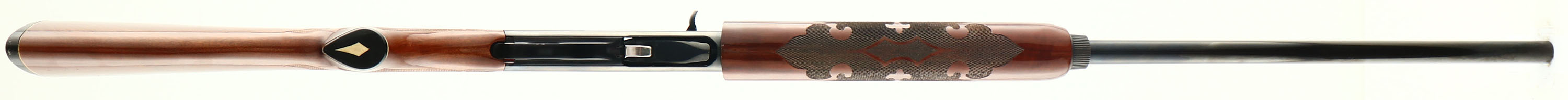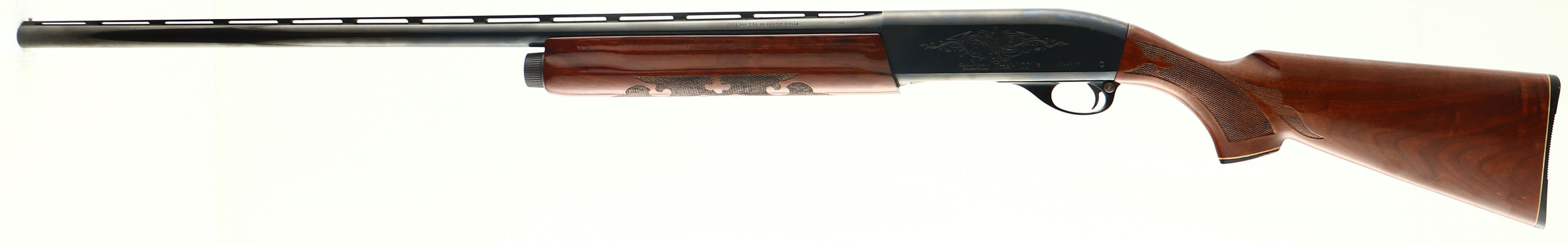 Remington Model 1100, CAL: 12GA, MFG: 1970, SN: L244618V, Semi-Auto Shotgun, Choke: Full, 30'' ventilated rib barrel. The receiver & bolt display an ornamental roll stamp engraving. The factory checkered & capped pistol grip wood stocks are excellent, displaying the original high gloss finish with very light handling marks. The metal blue finish rates 95% overall. Bore is excellent. The ventilated rib holds a single front bead. Buttstock carries a Remington black plastic buttplate. LOP: 14 1/8''. FFL or C&R Req. - Value: 400 to 800