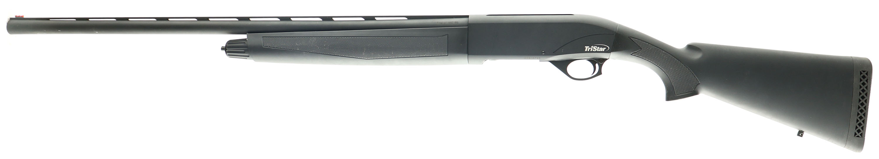 BOXED TriStar, Model Viper, 12 GA, MFG: Modern, SN:D5A167245, Semi-Auto Shotgun, 3'' chamber, has all three screw chokes, 28'' Ventilated rib barrel, with red fiber optic front bead. The original checkered & flat pistol grip composite stocks are excellent. The factory black metal finish rates 99% on barrel & receiver. Bore is excellent. Original ventilated recoil pad. With Sling studs. As NIB, with factory booklet, tubes, tool & case, & lock. FFL Req. - Value: 250 to 500