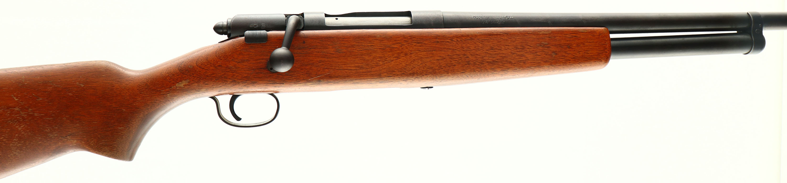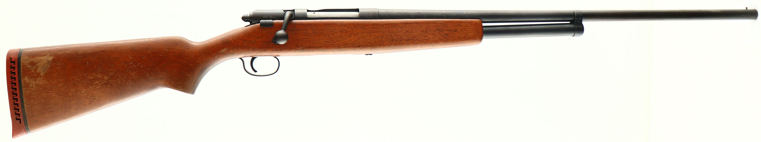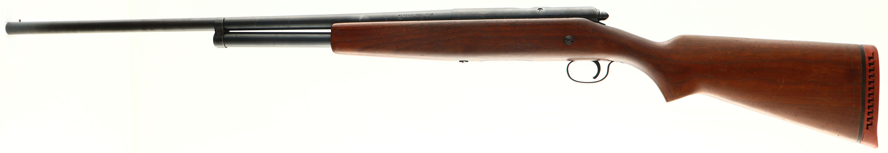 J.C Higgins, Model 583.22, CAL: 20 GA, MFG: 1950's, SN: NONE, Bolt Action Shotgun, Choke: Full 2 3/4'', 26'' barrel. The flat pistol grip wood stock is very good, carrying the original finish with many contusions, nicks & surface scrapes. The metal blue finish rates 70% overall, Bore is excellent. The barrel holds a single front bead. Buttstock carries a J.C. Higgins ventilated recoil pad. FFL or C&R Req. - Value: 200 to 400