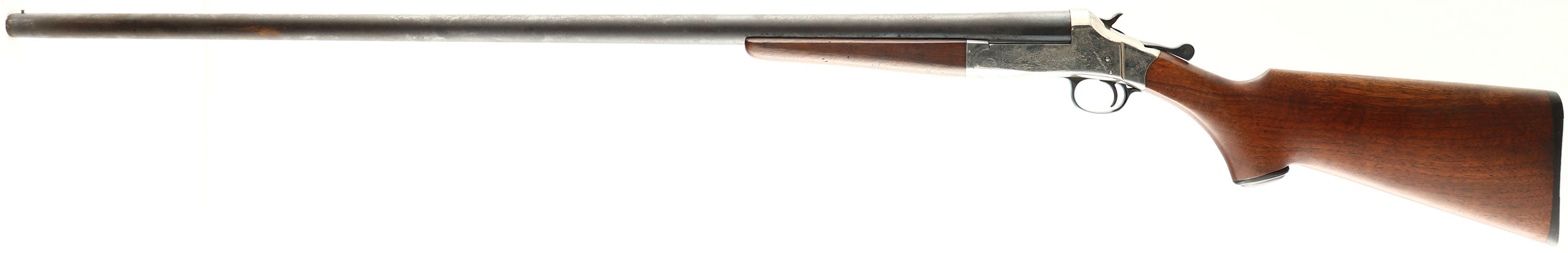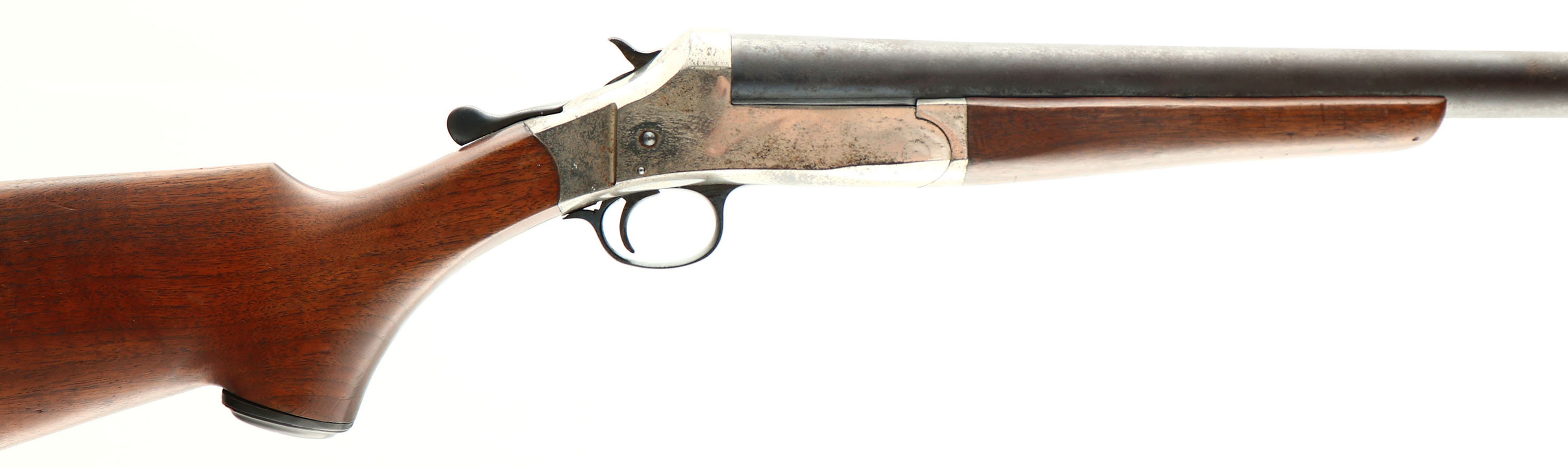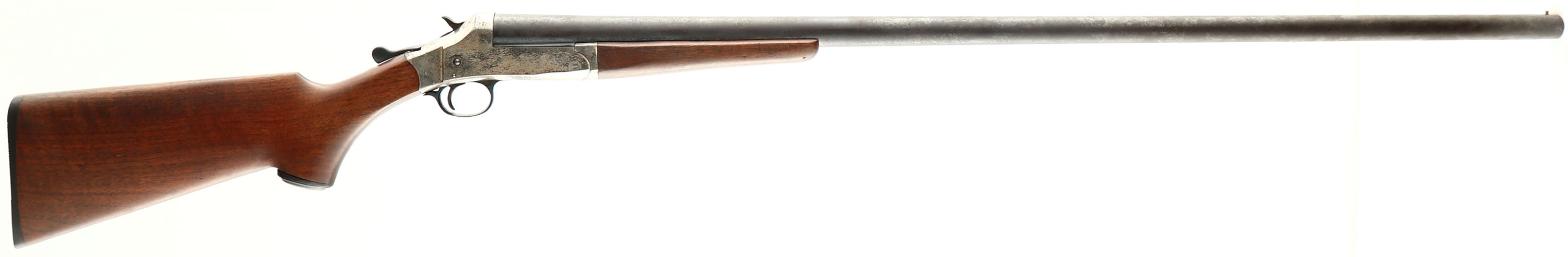 Belknap Hardware Co., Nitro Hunter, CAL: 12GA, MFG: 1890's-1930's, SN: A58472, Break Action Single Shot Shotgun, 36'' barrel. The capped pistol grip wood stocks are excellent. There are contusions & dings, mostly to the forend. The metal blue finish on the barrel has fully toned to a brown patina with consistent pitting throughout & the nickel finish on the receiver rates 60-70%, with consistent spotting throughout, toned to a brown patina. Bore is excellent. Brass bead front sight. Grooved plastic buttplate. FFL or C&R Req. - Value: 50 to 150