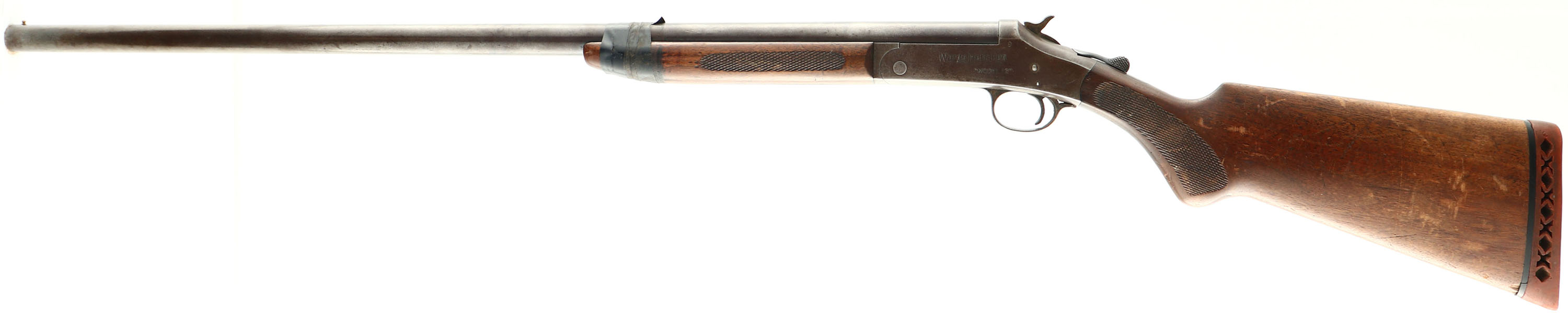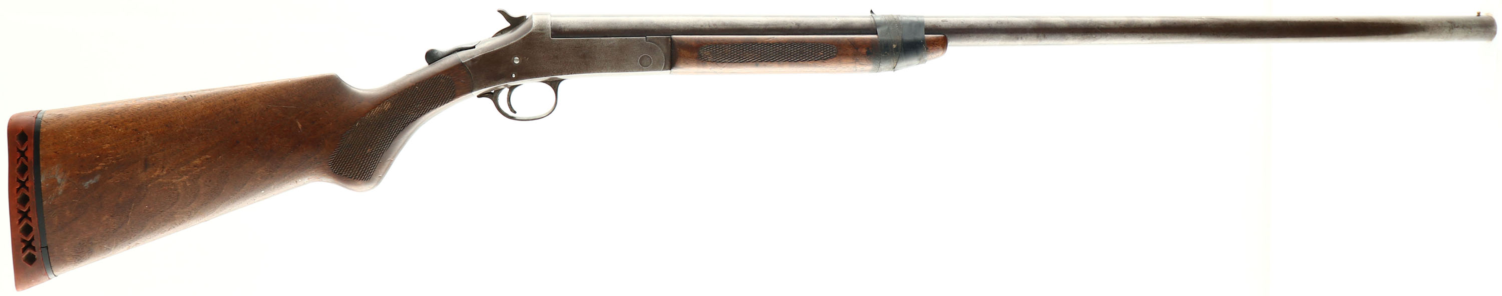 Ward's Hercules, Model 12, CAL: 12GA, MFG: N/A, SN: A877844, Break Action Single Shot Shotgun, 30'' barrel. The checkered round knob stocks are good & solid. There are a few small grain cracks, dings, scracthes & scrapes. The blued finish has full toned to a brown patina. Bore is excellent, with visible light wear marks. Barrel & forend held toegther by electric tape. Single front bead. Stock has worn ventilated red rubber recoil pad. FFL or C&R Req. - Value: 100 to 200