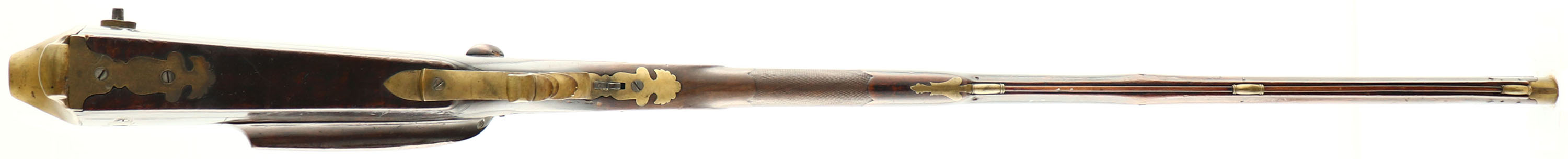 CONDITION: The checkered walnut stock is good with various small nicks, dings, scuffs & scratches from use/age. There is a 2'' crack in the belly of the stock. Two chip repairs on the left cheek of the stock, &a couple cracks at the tip of the forend with nail reinforcement. The barrel has been re-blued with light roughness under the finish. The finish on the barrel rates 97% with only a couple small spots of wear/patina. The barrel tang has toned to a mix of gun metal gray & brown patina. The brass parts all exhibit patina. The upper extension of the buttplate is marked with a script letter symbol. The bore is excellent, bright & shiny, smoothbore. The barrel has a brass bore sleeve, unknown if its original or if its been sleeved. The barrel holds a small, beaded post front sight with a large hood protector, & a small V-notch rear sight with another large hood protector. The wrist has a mount for a tang sight. The stock carries a brass buttplate, has a few dings & light patina. gun has no sling mounts, & has a stick in the ramrod channel. Antique/Airgun, No FFL Req - Value: 800 to 1600