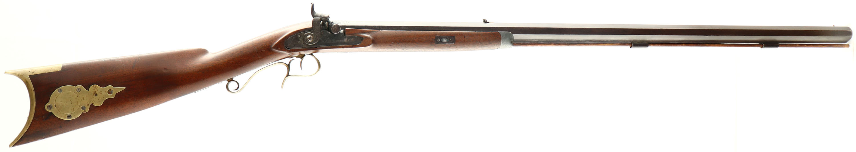 A.W Spies, Half Stock Kentucky Rifle, CAL: 35, MFG: 1840's-70's, SN: NONE, Percussion Muzzleloader, 32 1/8'' barrel. The right side plate is marked ''A.W. SPIES''. The top of the barrel is marked ''H. M'CLALLE?/ AUBURN''. The straight grip wood stock is good. There is a repaired break ahead of the lock plate, a couple small cracks, scrapes & dings. The blued finish on the barrel has fully toned to a brown patina, with edges worn to metal gray & some blue undertones remaining. Some pitting on/around the nipple & barrel. The side plate & hammer have worn to a mix of blue, brown patina & metal gray. The maker's name is bordered by scroll engraving & a bird game scene on the tail end of the sideplate. The brass hardware has an aged patina. Bore is poor, dark & rough. Fixed notch rear sight & blade front sight. Crescent metal buttplate Single trigger. Ramrod present. Blackpowder, No FFL Req. - Value: 250 to 450