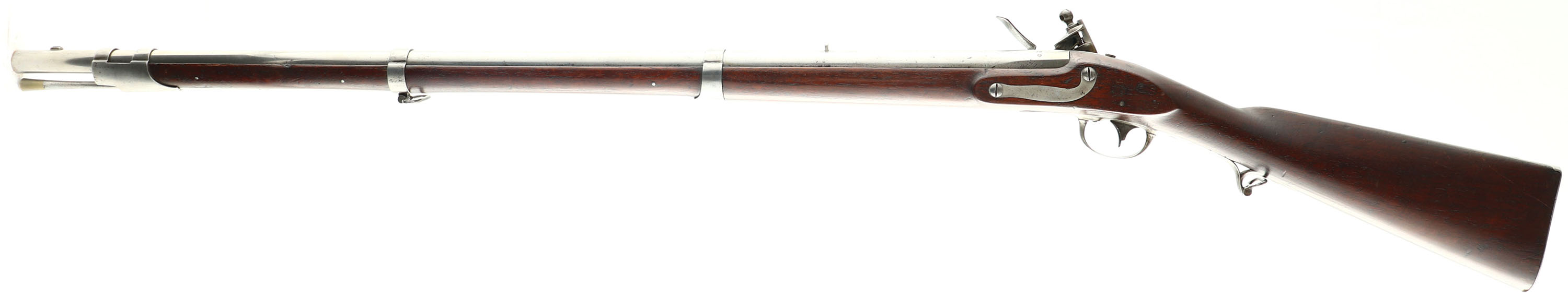 HISTORY: The story of the 1817 Rifle starts with the 1814 common rifle. The 1814 rifle designed by Robert T. Wickham & was produced by Henry Deringer of Philadelphia & R. Johnston of Connecticut. Wickham sent the pattern to Deringer with a contract for 1000 rifles. One of Deringer's rifles was then sent to R. Johnson to be duplicated, with a contract for 1000 more. The military liked these rifles & wanted more. They tweaked a few minor details & made up the 1817 common rifle. Harpers Ferry would produce a couple patterns of the weapon & send them out to multiple private contractors for them to copy & make. One of them was the Nathan Starr & Co. of Middleton Connecticut. They would make 10,200 total rifles from 1817-41. This rifle is from the contract of 1840 for 6000 rifles. These were some of the last flintlock guns made for the military as the US would soon adopt the Model 1841 Mississippi rifle, in 1841, that had a percussion lock & was rifled. Common rifle came from 1840 Ordnance Department records to differentiate between the muzzleloading rifles, & the breech loading Hall rifles. before this it was just called the 1817 rifle. Many of these rifles were converted to percussion, or left with the flintlock & used in the civil war. These were a lot higher value & more favored than many other flintlocks since they were rifled, not smoothbore. 5,000 US M1817 Rifles were in storage at the Benicia Arsenal in San Francisco in 1861, and many of these rifles were issued to the 1st California Volunteer Cavalry, who fought in the far western theater against Confederate forces in New Mexico and Arizona. Even as late as March of 1863, Common Rifles were showing up in Confederate arsenal inventories. This rifle has been bored to .62 Cal & made into a smoothbore, unknown when but it was mostly likely done after the Civil war by a gunsmith to fix a worn out bore.