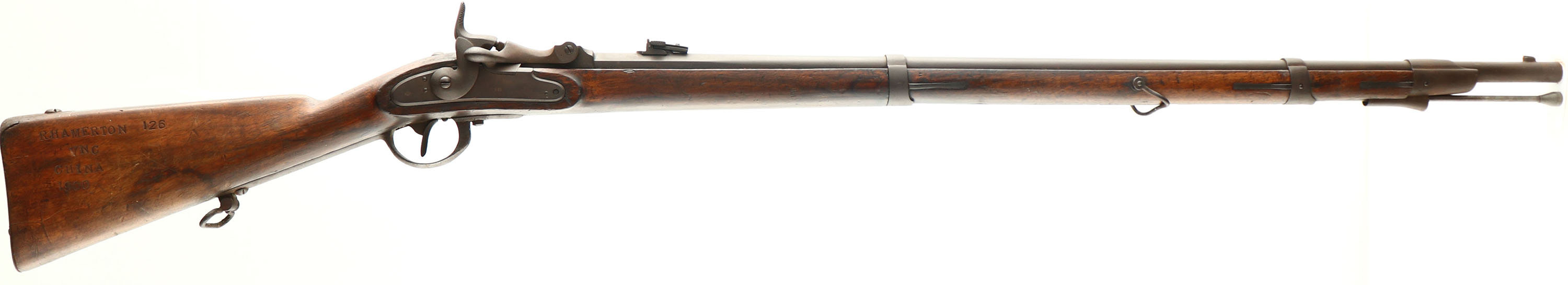 HISTORY: this rifle started life as a Model 1854 Lorenz Percussion muzzleloader. This was the main infantry rifle used by the Austrians when they were defeated by the Prussians during the Austro-Prussian war of 1866. The Austrians were overwhelmed by the Prussians Dreyse Need fire breech loaders. After this Austria would start to look for a breech loading rifle. A Viennese gunsmith Franz Wenzel, would design a breech loading conversion of the Lorenze rifle that was much like Allens conversion of the Springfield rifles into trapdoors. The design proved strong & the Austrian army like the cheaper idea of converting their old rifles & not making new ones. They would adopt the Wanzl conversion in 1867 as a stop gap until they could develop a more modern breech loader. Later on in 1867, Austria would adopt the M1867 Werndl Holub rifle as the new infantry rifle. The Wanzel rifle would be replaced in service as Werndl rifles were made until they were sold off as surplus in the 1880s & 90s. Many Wanzel rifles were sold to China around this time, like this rifle here. This rifle was captured during the Boxer rebellion (1898-1901) by a member of the Australian Victoria Naval Contingent, Roger bocking Hamerton, service number 126, his rank was stoker. He would set off to China abord the SS salamis on July 30th 1900.