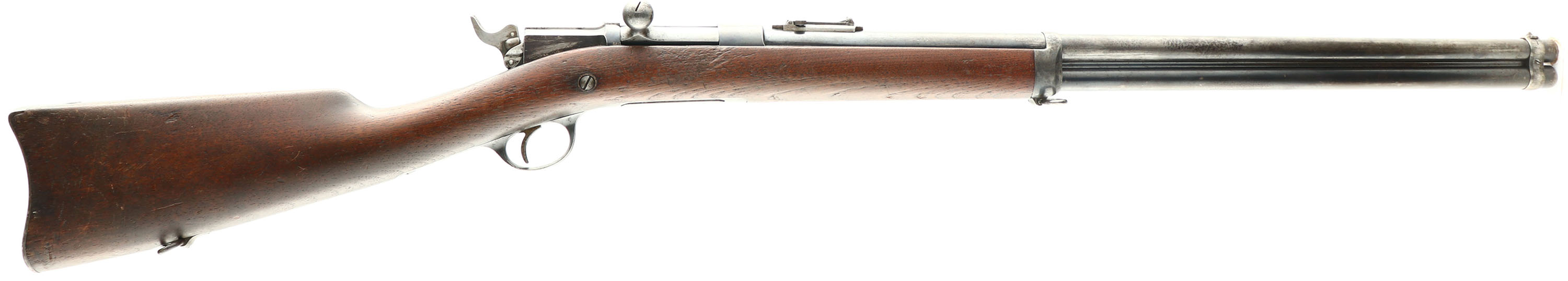 CONDITION: The straight wrist walnut stock is very good with some minor nicks, dings, scuffs & scratches. The left side of the wrist has a faded inspectors cartouche. There is a 2'' hairline crack on the right of the wrist, emanating from the screw escutcheon. The original blued metal finish rates 15% on the barrel with most of the barrel worn gray & starting to tone brown. The magazine tube rates 35%, again with spots of wear showing gray & starting to tone brown. The blued finish on the receiver rates 25% with more spots of wear showing gray & toning brown. Other metal parts have finish wear, speckling of brown patina & roughness. The left side of the receiver is marked ''U.S.I.D. 160''. This is the US dept. of the interior stamp & the rifle number from that batch stamp. He left side of the receiver band is marked ''H.N.'', this is the inspector stamp for Henry Nettleton. The top of the receiver band is marked with an arrow, ''P,'' & ''W.W.K.''. the ''W.W.K.'' stamp is the initials for US navy inspector Lt. William W. Kimball. the left rear of the barrel has another ''H.K.'' stamp. The top of the barrel, under the rear barrel band is stamped with a mix HP mark where the H shares the staff of the P as the left leg of the H. the rear of the bolt is marked with the Remington address with patent dates, ending in ''July 31, 1877''. The S/N ''451'' is stamped on the inside of the trigger guard tang. The bore is good. Its bright & shiny with proud rifling, but has roughness & a couple spots of light pitting. The barrel holds a small barleycorn front sight with a ladder U-notch rear sight marked 1 to 10. The stock carries a steel buttplate, toned dark with spots of cleaned rust/light pitting. The rifle has both bottom sling loops. Antique, No FFL Req - Value: 5000 to 10000
