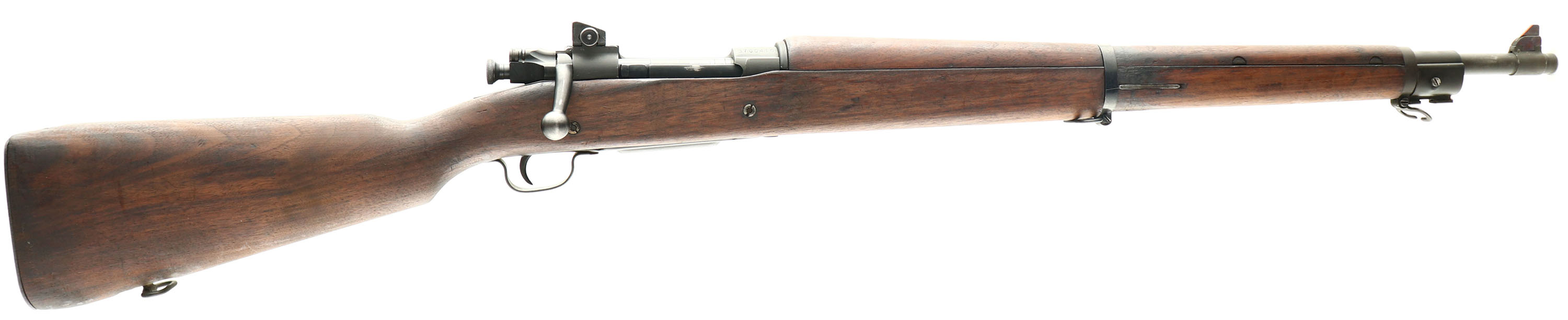 CONDITION: The semi-pistol grip walnut scant stock is very good with some minor nicks, dings, & scratches. stock has spots of oil stains. The Metal has an arsenal re-finish with spots of roughness under the finish & some markings being faded. The parkerized metal finish on the barrel rates 90% with minor thinning. The parkerized metal finish on the receiver rates 95% with light thinning. the receiver band is marked ''U.S.'', ''SMITH-CORONA'', ''MODEL 03-A3'', & the S/N. The top end of the barrel is marked ''S C'', flaming bomb, ''3-43''. The bolt handle is stamped ''8''. The bore is excellent. Bright & mirrorlike with little to no visible wear. Early four groove rifling barrel. The barrel holds a relaced, dovetail wide blade front sight with red paint. The receiver has mounted a fully adjustable, aperture rear sight. The stock carries a checkered parkerized steel, trapdoor buttplate. Nothing inside trapdoor. Rifle has both bottom sling loops with the third stacking swivel. FFL or C&R Req - Value: 650 to 1300