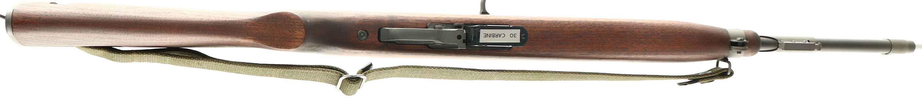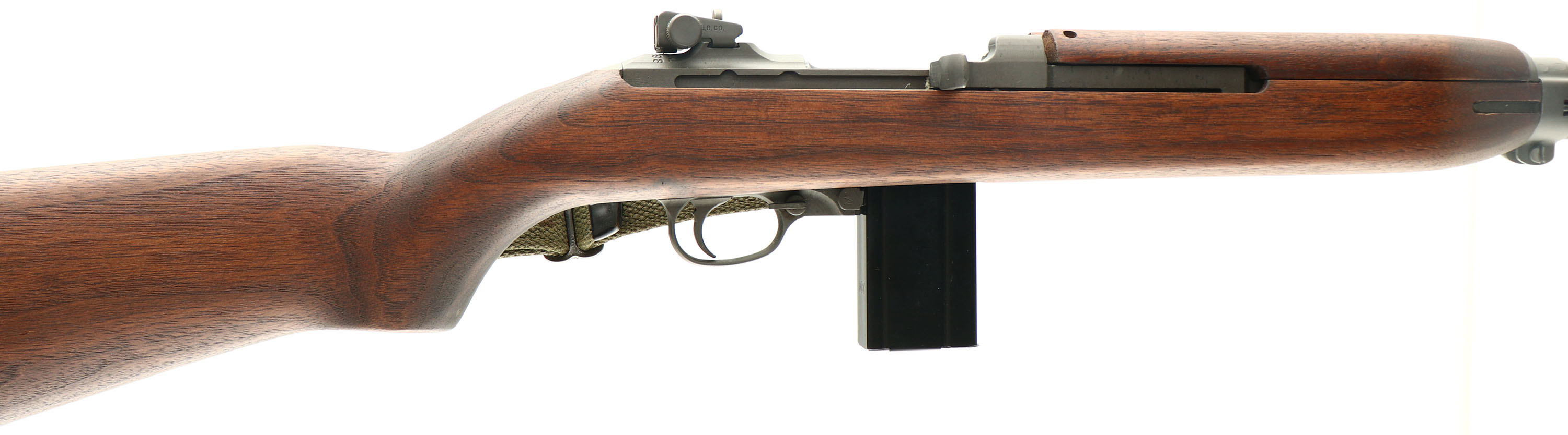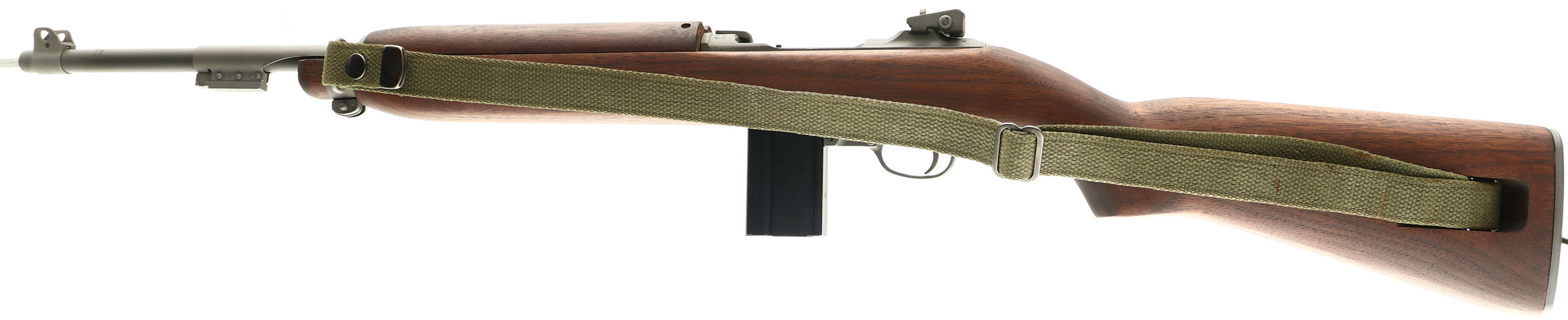 CONDITION: the semi-pistol grip walnut stock is excellent. Type 3 stock. The right cheek has a crisp crossed cannon US acceptance cartouche. The sling well is stamped with the MFG mark ''IO'' for the S.E. Overton company of South Haven Michigan. Their prime contractor was Inland. The parkerized metal finish rates 98% with minor wear. The front receiver band is marked ''U.S. CARBINE'', ''CAL .30 M1''. The rear of the receiver is marked ''INLAND DIV'' & the S/N. The top end of the barrel is marked ''INLAND MFG DIV.'', ''GENERAL MOTORS'', ''5-43''. The barrel band is marked ''M M Q''. The rear sight is marked ''J.R. Co.'', mag release marked ''M'' & ''WA'', & the front sight is marked ''U''. This rifle has the 3rd style barrel band with bayo-lug, updated 15 & 30 Rd mag release, updated rotary safety, & updated adjustable rear sight. The bore is excellent. Its bright & mirrorlike with a couple spots of light roughness. The stock carries a checkered, parkerized steel buttplate, has a spot of patina. The rifle has the front, left side mounted sling loop, & a sling well for use of a oiler bottle for the rear sling mount. has oiler bottle & period correct green canvas sling. comes with one 15 rd. mag. FFL or C&R Req - Value: 800 to 1600