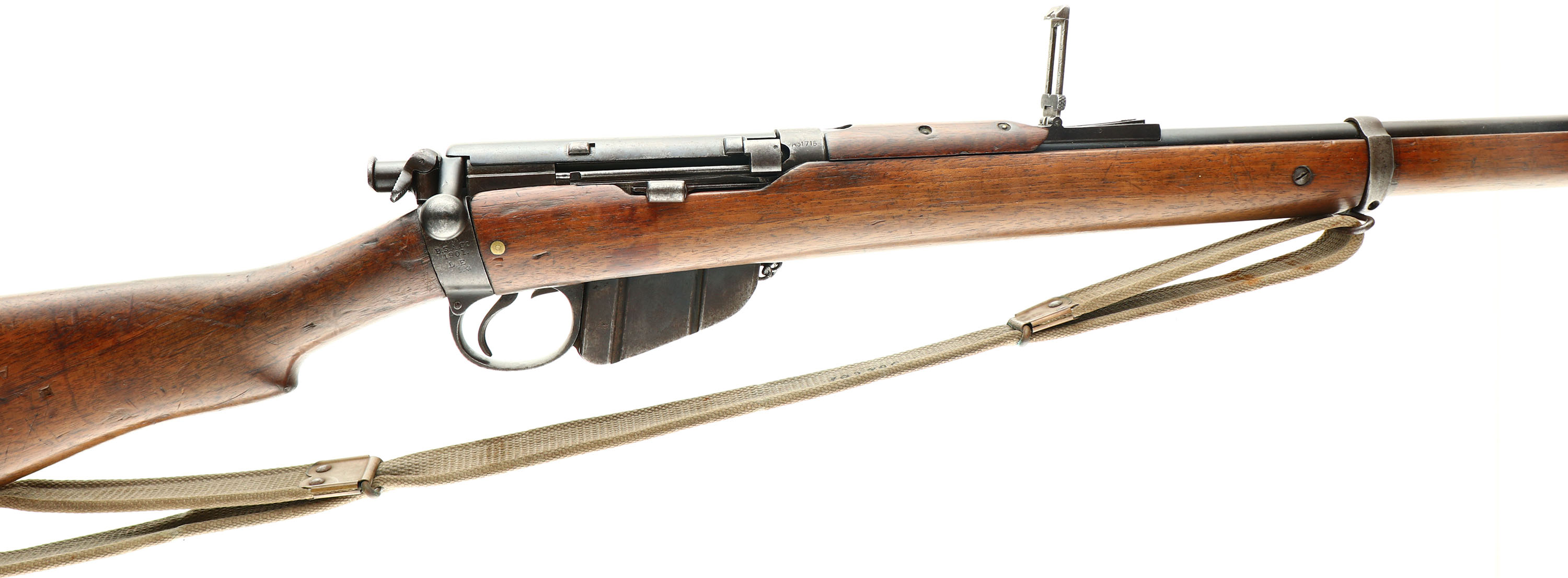 CONDITION: The two piece, semi-pistol grip walnut stock is very good with various nicks, dents, chips, & scratches. the left side of the forend, just in front of the mag has two 1/4'' wood plug repairs. The tip of the forend has a crack. The upper handguard had a 1 7/8'' section on the left front side chip off & was glued back together, repair is tight & looks professional, possible done by a arsenal. the right cheek of the stock is stamped ''W.EVANS''. The right cheek of the stock is stamped ''AUSTINS'', ''AUSTINS'', ''W.EVANS'', ''TIMARU''. Over the ''TIMARU'' stamp is the faint remains of the acceptance cartouche, under that is stamped ''II*'', marking is faded as well. The heel of the stock, just in front of the buttplate, has a faint ''S S'' with two broad arrows stamp which denotes it was sold out of military service. The stock appears to have been sanded & refinished when it was shortened into a club rifle with the Military markings being faded/worn & the other stamps still being intact. The metal has a old re-blue, unknown if its a arsenal or done when it was cut down. Spots of roughness/cleaned pitting under the finish The blued finish on the barrel rates 65% with scratches, spots of thinning & spots toning brown. The receiver has toned to a mix of gun metal gray & brown patina with some blue remaining in protected areas. The receiver dust cover retains a fair amount of its blue but has spots of wear that are toning brown. The left side of the receiver band is marked with a worn proof, stamped over that proof is the worn ''HG'' home guard stamp, just above that is a worn ''SA'' stamp. The top of the band is marked ''4161'', this is likely a rack number from its shooting club or home guard days. The right side of the band is marked with the S/N. The Knox form (the top of the chamber just in front of the receiver) is marked with three overlapping stamps, one is the ''E'' for Enfield rifling, one is the standard British nose-to-nose broad arrows stamp. & the last stamp is the ''S S'' stamp which denotes it was sold out of military service. Remains of red paint on the Knox form as well. The right side of the wrist band is marked with a crown over ''V.R.'', ''B.S.A.Co'', ''1901'', ''L.E.'', ''I*''. the upper tang of the buttplate is marked ''N.S.Z.'' over ''18067/1901'', with a arrow proof & another small British proof. The top of the barrel, just in front of the rear sight is marked ''S''. S/N Mismatched bolt. Rotary safety lever on back of bolt. The bore is very good. Its bright with light roughness. The barrel holds a square post front sight with a tangent/ladder V-notch rear sight marked 200 to 500 on the base & 6 to 18 on the ladder. The long range volley sights are intact on the rifle, front & rear. The stock carries a brass trapdoor buttplate, has some dings & patina. There is nothing inside the trap door. Rifle has both bottom sling swivels & comes with a British white canvas sling, brass hooks with no visible markings. The sling has the number ''302795'' handwritten in black ink. A Interesting rifle that has had a long life of service. FFL or C&R Req - Value: 500 to 1000