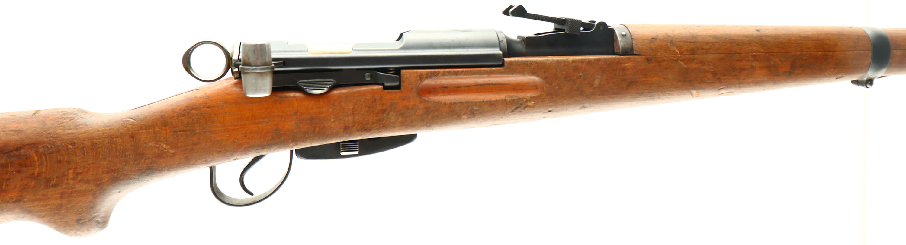 Waffenfabrik Bern (Swiss), Model: Kar.31 (K31), Cal: 7.5x55mm Swiss, MFG: 1948, S/N: 917054, Bolt action straight pull rifle, 26'' barrel. The semi-pistol grip beech wood stock is very good with nicks, dents, chips, scratches, & stains from use/age. There is a crack on the tip of the forend, between the stacking rod & barrel. Stock has no visible cartouches. Under the buttplate the stock is marked ''VII 48''. The blued metal finish retains almost full coverage with a few scratches/scuffs & spots of thinning. Overall finish rates 85%. The left side of the receiver is marked with the S/N. The left side of the receiver band is stamped with import marks. The top of the receiver band has the Swiss crest. The top of the barrel, right where it meets the receiver is marked with the last 3 digits of the S/N, backwards ''B'' spliced with ''P'' proof, & two more Swiss proofs. S/N matching bolt, barrel, & magazine. The bore is excellent. Bright & mirrorlike with little to no visible wear. The barrel holds a squared blade front sight with protective wings, with a tangent U-notch rear sight marked 1 to 15. The stock carried a steel buttplate, left in the white & has speckled patina. No id tag under the buttplate. The rifle has bolt left side sling mounts. Comes with sling clasp on rear sling bar. The Swiss K31 is the last iteration of the Schmidt-Rubin series of rifles & was the last bolt action the Swiss military adopted. Replaced in 1958 by the SIG Stgw.57, it was used by certain units up till the 1970s making it one of the last Bolt actions that was still used by a military. Praised for their accuracy & smooth actions this rifle here would make a fine shooter to add to any collection. FFL or C&R Req. - Value: 350 to 700