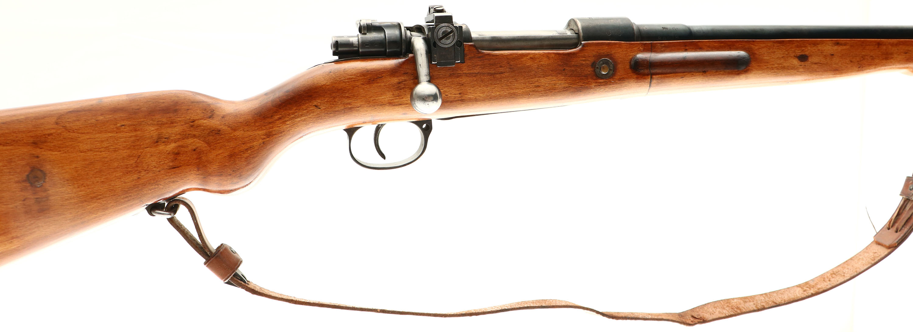 Amberg Arsenal, Model: Gewehr 98, Cal: 7.92x57mm (8mm Mauser), MFG: 1916, S/N: 6539 (serial block n), Bolt action rifle, 22'' barrel. The semi-pistol grip wood stock is very good as being cut down, shaped, sanded & re-finished. There is a duffle cut repair just in front of the magazine, repair is solid. There is a resin plug fill on the buttstock & on the bottom of the forend. there are the faint remains of the outlines of a couple cartouches on the belly of the stock & bottom of the wrist. The metal has been re-blued & rates 80% with spots of thinning & light patina. The left side of the receiver is marked ''GEW.98'' in German script. The left side of the receiver band is marked with the S/N & a lion proof. The top of the receiver band is marked with a crown over ''AMBERG'', ''1916''. The barrel is marked with a few small proofs & misc. part/assembly numbers. S/N mismatched bolt, trigger guard & magazine floorplate. All bolt components S/N match. Bolt appears to be from a K98k with Waffenamt proof marks & having a bent bolt handle. The bore is good. its bright with roughness. The barrel holds a aftermarket beaded blade front sight marked ''PACIFIC''. Rear sight is a receiver mounted Aperture rear sight marked ''REDFIELD''. Both sight bases have light speckled surface rust. The stock carried a ''AIROGEL'' rubber recoil pad. The rear sling mount is original with a added front swivel to the forend. Rifle comes with leather sling. FFL or C&R Req. - Value: 200 to 400