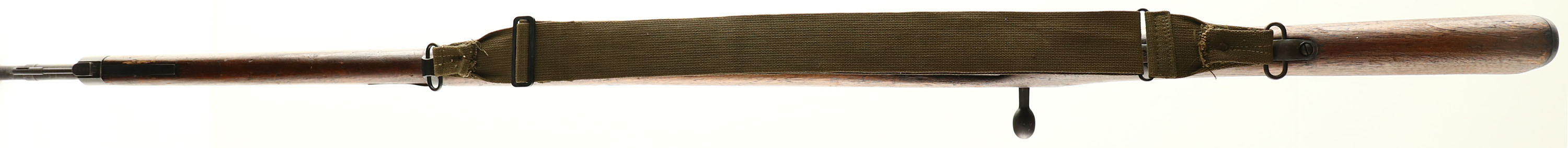 Tokyo Artillery Arsenal, Model: Type 38, Cal: 6.5x50mmSR, MFG: 1906-23, S/N: 986144, Bolt action rifle, 31 1/4'' barrel. The semi-pistol grip Japanese Walnut stock is good. Has various nicks, dings, gouges, vice marks, & scratches from use/age. Japanese style two-piece buttstock. Right side of stock has spots of white paint. Glue has been added to the left side of the joint between the two-piece buttstock. The upper handguard has a couple small cracks & grain pops. The blued metal finish on the receiver rates 75% with spots of thinning & brown patina. The blued metal finish on the barrel rates 80% with wear/thinning at the muzzle & spots of brown patina. Left side of the receiver is marked with the S/N, Tokyo Arsenal logo, & two small inspector stamps. The top of the receiver band is marked with a fully intact chrysanthemum, & ''TYPE 38'' in Japanese. The rear receiver bridge is marked with a small triangle in circle stamp & a small circle stamp. The left side of the barrel is marked with a small triangle in circle stamp, & ''S''. S/N mismatched bolt & marked parts. The bore is very good. Has strong rifling with roughness. The barrel holds a barleycorn front sight with a flip up ladder, V-notch rear sight marked 5 to 24. The stock carries a blued steel buttplate with worn finish around the edges. Rifle has a cleaning rod & both bottom sling loops. Rifle comes US Vietnam era green canvas carry strap that was converted into a sling. a nice example of a non ground Mum Arisaka. FFL or C&R Req. - Value: 250 to 500