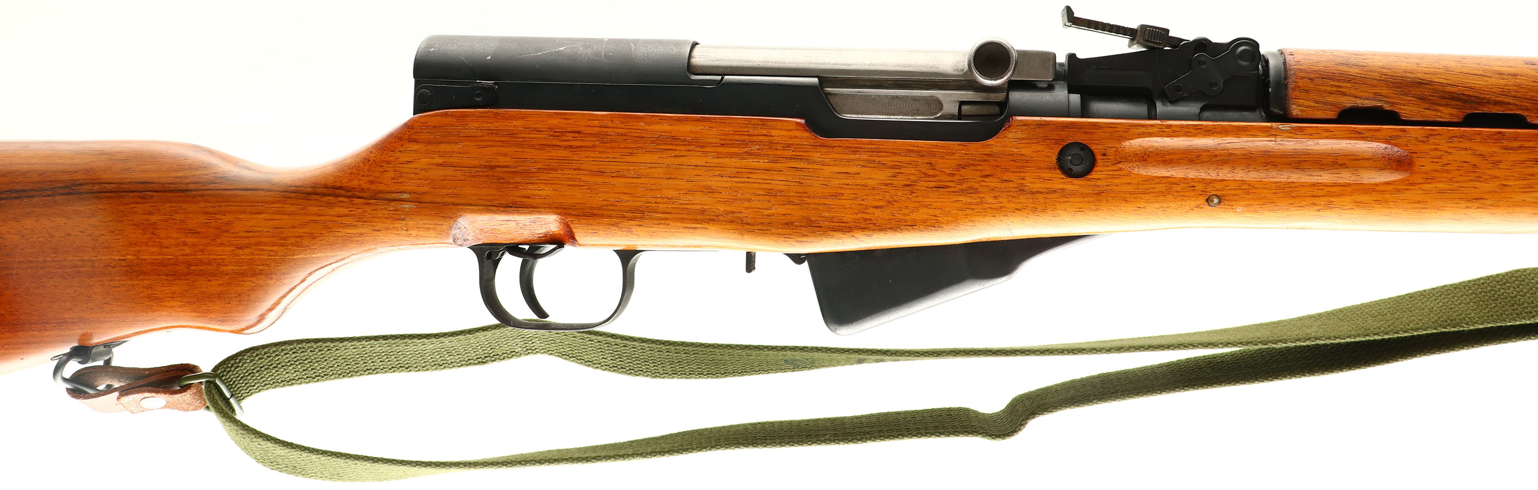 Norinco (China), Model: Type 56 SKS, Cal: 7.62x39mm, MFG: 1990s, S/N: 150774, Semi-auto rifle, 20 '' barrel. The semi-pistol grip wood stock is excellent with some minor scuffs, nicks, & scratches. The rear of the gas tube has over applied stock varnish on it. there is a ''Kill'' notch in the bottom of the stock just in front of the rear sling loop. The metal has been re-blued & rates 90 % overall with scratches, spots of thinning & spots of light patina. The left side of the receiver is marked with the S/N, & import markings. The front of the receiver & the rear of the barrel are marked with proofs. The Bolt carrier, receiver cover, magazine & trigger guard, all have had the S/N ground/buffed off. The remains of the Bolt carrier & receiver cover S/Ns show they are mismatched. The bore is excellent, bright & mirrorlike with little to no visible wear. Chrome lined bore. The barrel holds a post front sight with a round protective hood, with a tangent U-notch rear sight marked 1 to 10 with a battle zero marked ''n''. The stock carries a steel trapdoor buttplate with a complete original cleaning kit inside. They bayonet has been removed but still has the bayonet lug & screw. Rifle has cleaning rod. Comes with surplus Chinese SKS, green canvas sling. A Beautiful example of a type 56 SKS. FFL Req. - Value: 400 to 800