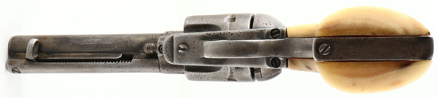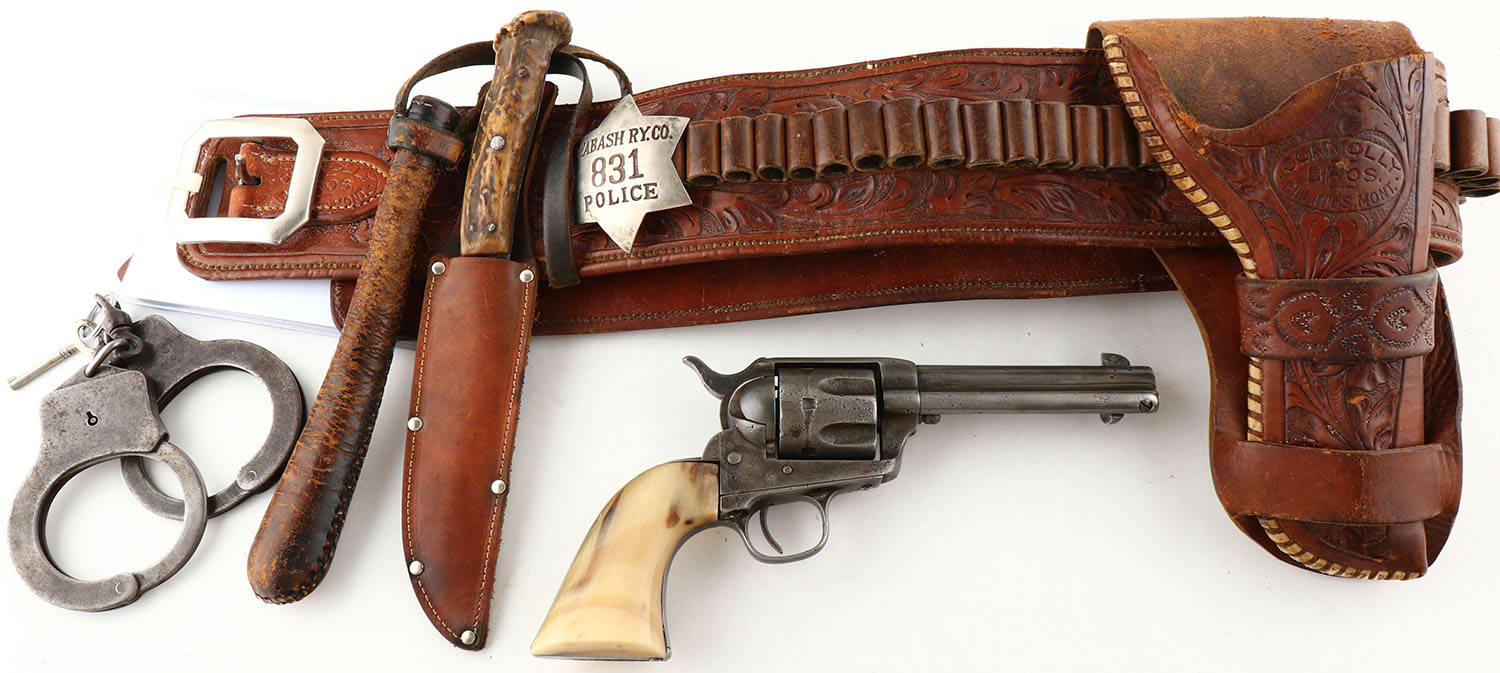 UNIQUE SET, Colt 1873 Single Action Army, CAL: 44, MFG: 1883, SN: 88482?, Single Action Revolver, 4 3/4'' barrel. The top barrel address has worn smooth & is not visible. The left side of the barrel is faintly marked ''44 COLT''. The left side of the frame is marked with the standard three line patent dates. The Rampant Colt logo is not visible. The left side of the trigger guard is faintly marked ''44 CAL''. Partially legible, all matching SN on the frame, trigger guard & butt. The cylinder is marked ''4706''. The polished bone grips are exellent. There are a few minor cracks around the edges. The original metal finishes have fully worn to gun metal gray. There are remnants of applied finish, thin brown patina & intermittent pitting throughout. Bore is poor, dark & rough, with consistent pitting. V-notch integral rear sight & blade front sight. This revolver is accompanied by a early 1900's Connolly Bro's tooled ammo belt & matching double looped holster. Connolly opened it's first shop in Klamath Falls, OR in the late 1800's, closed the doors in 1900, then re-opened a couple shops in Butte & Billings, MT before permanently closing the doors in 1927. This set is from the Billings location. The belt carries a black Jack Sap, a pair of unmarked handcuffs (with functional key) & an unmarked knife sheath that holds an unmarked blade with bone handle. The belt is decorated with a badge marked ''WABASH RY.CO 831 POLICE''. Another neat custom Old West set. Antique, No FFL Req. - Value: 2000 to 4000