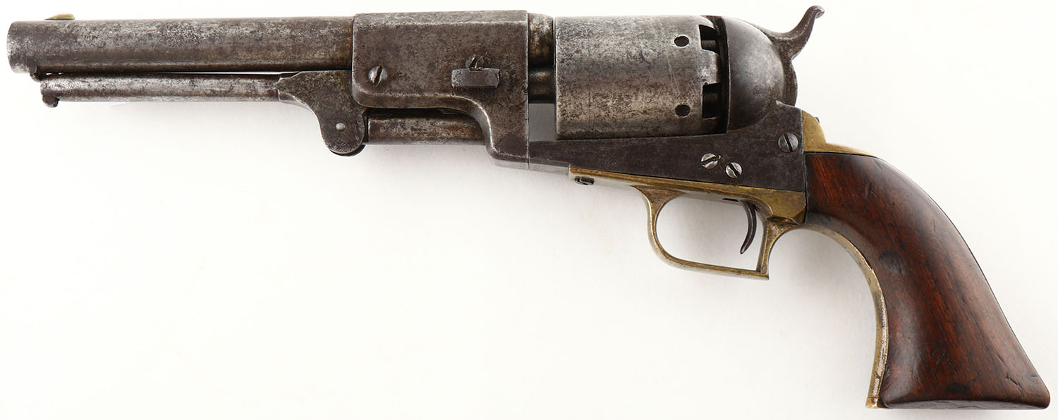 RARE & FANTASTIC, Colt, Model Dragoon 1st Model, CAL: .44, MFG: 1848-50 SN: 3223, Single Action Percussion Revolver, 7 1/2'' barrel. The Colt Dragoon 1st Model, a .44 caliber percussion revolver, was a popular firearm during the 1850s & 1860s, particularly among U.S. Dragoons & civilian pioneers. It was known for its robust construction & reliability in the harsh conditions of the frontier. The 1st Model featured a shortened barrel & cylinder compared to earlier models, making it more manageable & easier to carry. Key features of the Colt Dragoon 1st Model: Caliber: .44, Barrel Length: 7 1/2 inches, Cylinder: 6-shot, Trigger Guard, Square back, brass, Frame: Color case-hardened steel, Grip: One-piece walnut, Loading Lever Catch: A simple spring catch under the barrel to prevent the lever from falling during firing. The 1st Model Dragoon was issued to the U.S. Mounted Rifles (USMR), also known as the Dragoons, in the antebellum era & during the Civil War. Until some Colt M-1851 Navy revolvers were ordered in 1855, the Dragoon remained the only revolver in significant numbers to be in use with the US military. There are portraits of Confederate & Union cavalrymen with various Dragoon models. The Dragoon was a favorite among Texas Rangers & 49ers during the California Gold Rush. The Dragoon's rugged design & reliability made it well-suited for frontier use. Colts Dragoons experienced some of the harshest conditions the mid-19th century had to offer, & it is amazing that any survived, in any condition. This pistol was designed for use by horse-mounted rifleman, & it is so much pistol that you will want a horse to carry it for you because of its significant weight. Colt only produced about 7,000 of these 1st models from 1848-50, with this pistol being produced the first year (1848) & just one year after the Walkers. The wood grips are very good, displaying numerous minor contusions, rubs & nicks, all of which have smoothed with age & use. The case-hardened metal finish has worn to a mix of gun metal gray & brown patina. The brass trigger guard/grip display fantastic age & patina. The cylinder displays the faint remains of Texas Ranger & Indian fight scene. Stamped ''ADDRESS SAML COLT NEW YORK CITY'' along the top of the barrel. Left side of frame stamped ''COLT PATENT U.S.''. Matching SN visible on the barrel, frame, trigger guard, & back strap. Bore is very good. The barrel features a German silver blade front sight & hammer notch rear sight. Cylinder slips on advancement as it has a missing or broken hand-spring. A rarely seen Dragoon survivor & one with strong authentic eye appeal. Own the original! This is a legitimate antique & not a reproduction. Antique, No FFL Req. - Value: 6000 to 10000