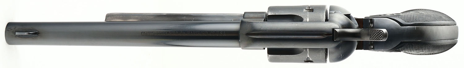 Colt, 1873 Single Action Army, CAL: 44-40, MFG: 1907 (frame), SN: 290993, Single Action Revolver, 7 1/2'' barrel. This revolver is compiled of mis-matched parts. The replaced barrel is marked ''COLT FRONTIER SIX SHOOTER''. The left side of the frame has the standard two line patent dates & the circled Rampant Colt logo. The SN can be found on the frame, trigger guard & butt. The replacement Rampant Colt checkered hard rubber grips are excellent. There are minor contusions & scrapes. The original metal blue finish on the replaced barrel rates 95%. The frame, cylinder & trigger guard have been buffed & refinished, rating 80% coverage, with areas of thinning, toned to a brown patina. Bore is excellent. U-notch rear sight & blade front sight. Perfect for a utilitarian shooter who isn't worried about condition or originality. FFL or C&R Req. - Value: 500 to 1000