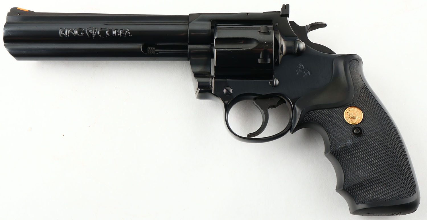 BOX & CASED, Colt, Model KING COBRA, (AA3660), CAL: 357 MAGNUM, MFG: 1992, SN:VK1234, Double Action Revolver, 6''' barrel. First introduced in 1986, the Colt King Cobra is a medium ''V'' frame double-action revolver made of very hi-grade carbon steel & featuring a six round cylinder. The bright blue finish of the initial offering in both 4'' & 6'' lengths were offered from 1986-1992. It was marketed to both aw enforcement agencies & civilian firearms enthusiasts. Two subsequent offerings of this model were later produced, however collectors gravitate to these early production models, which subsequently demand a higher collector value. The left side of barrel is stamped ''KING COBRA''. The right side ''357 MAGNUM CARTRIDGE''. They came with Colt gold medallion Pachmayr black checkered rubber grips, with finger grooves. The grips on this example are excellent. The high polish blue finish is 99%, excellent. Bore is excellent. The solid rib barrel holds a screw height adjusting white ''U'' notch rear sight & front blade, with the serrated orang insert. This gun comes with original blue plastic case, in the original numbers matching outer sleeve box, with hang tag, packaging & instruction manual. Excellent overall & highly collectible. FFL Req. - Value: 1500 to 2500