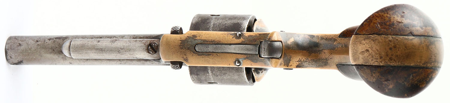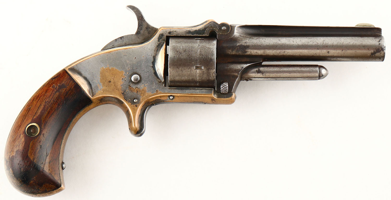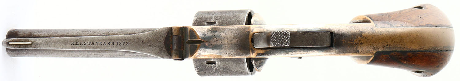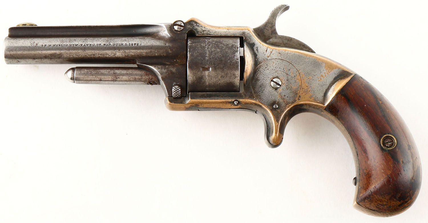 Marlin, XXX Standard 1872 - 2nd Varation, CAL: 32 SHORT, MFG: 1872-73, SN: 2483, Single Action Revolver, 3'' barrel. The left side of the barrel is marked ''+ J.M MARLIN NEW-HAVEN CT PAT JULY 1 1873'' & the top of the barrel is marked ''XXX STANDARD 1872''. The original birdshead wood grips are excellent. There are contusions & dings, with remnants of original finish. The original metal blue finish on the barrel has mostly worn to metal gray & toned to a brown patina, with remants of blue remaining in protected areas. The silver/nickel finish on the frame rates 40%, with areas worn brass. The exposed brass frame has an attractive aged patina. Bore is fair, dark & rough. Integral notch rear sight & small blade front sight. Manufactured only 1872-1873 in three different variations. Antique, No FFL Req. - Value: 600 to 900