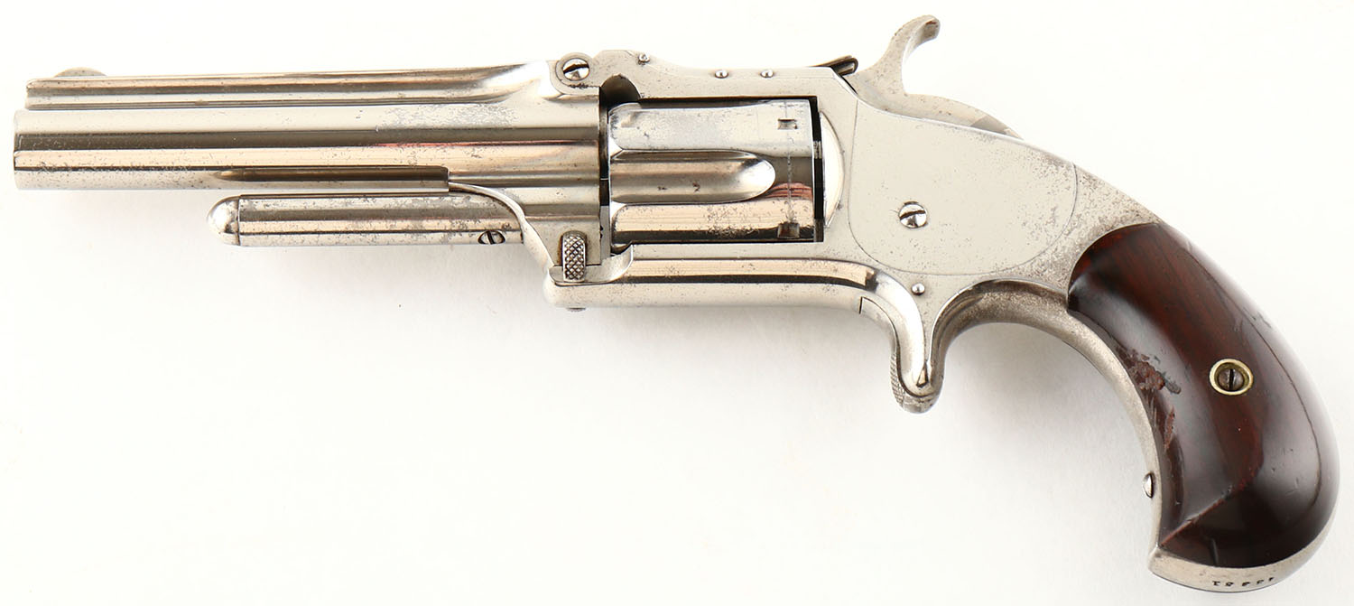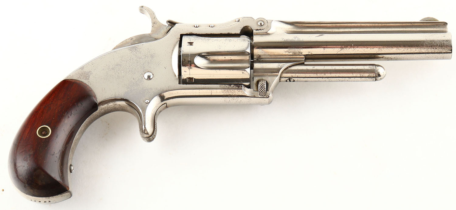Smith & Wesson, Model Number 1 1/2 ''New Model'', CAL: 32 RF, MFG: 1868-75, SN: 45351, Single Action Revolver, 3 1/2'' barrel. The top of the barrel is marked ''SMITH & WESSON SPRINGFIELD MASS PAT APR 3, 55. JULY 5, 59 & NOV.21.65''. The full SN is stamped on the butt. The original bird's head grips are very good & solid. The left grip has some dings & scarring. The original nickel finish rates 90% overall, with intermittent speckling throughout. Bore is very good & bright, with a couple small areas of spotting/light pitting. Notch rear sight & low profile blade front sight. A very nice example of a Model 1 1/2. Antique, No FFL Req. - Value: 700 to 1200