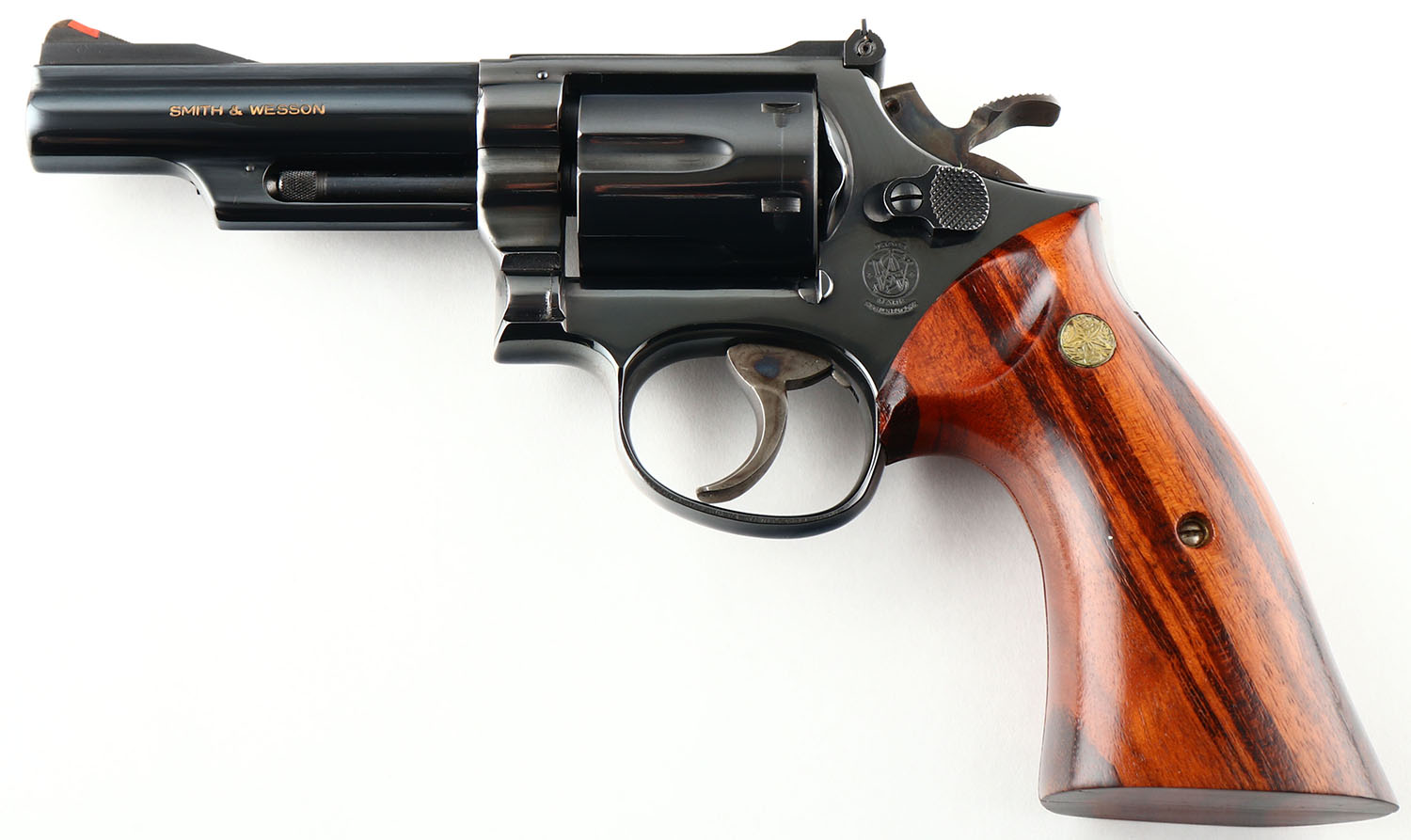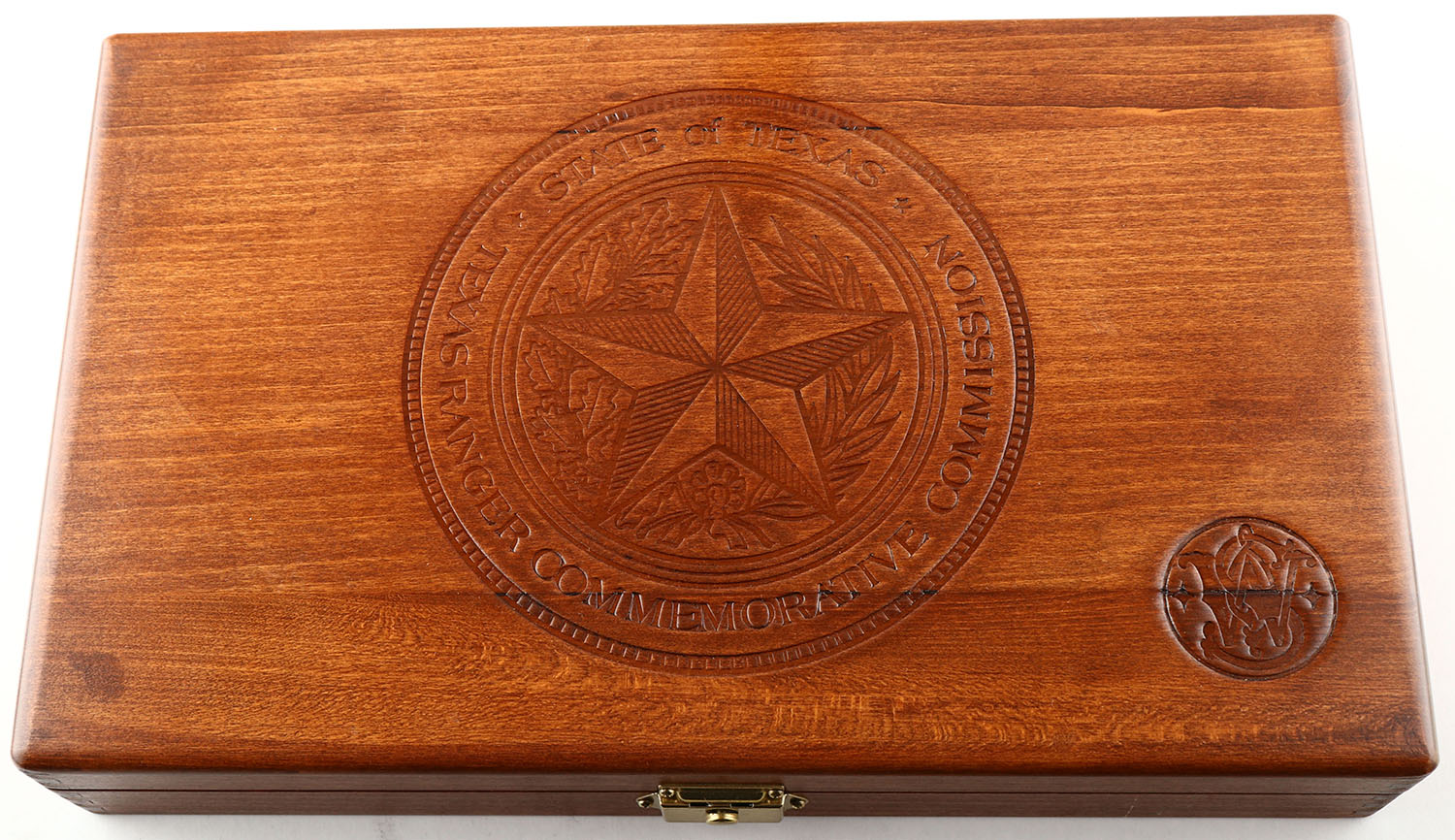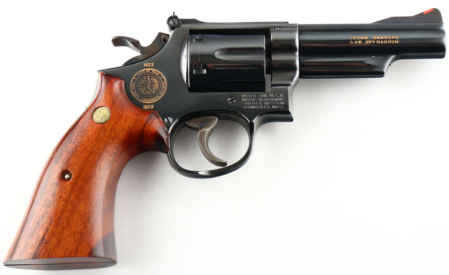 CASED, Smith & Wesson Model 19-3 Texas Ranger Commemorative, CAL; 357 MAG, MFG: 1973, SN: TR9495, Double Action Revolver, 4'' barrel. The right side of the barrel is marked ''SMITH & WESSON'' & the right side of the barrel is marked in two lines ''TEXAS RANGERS/ S&W .357 MAGNUM''. The left side of the frame has the S&W trademark logo. The right side of the frame has the standard four line address stamp & the commemorative seal. The barrel markings & seal are gold washed, with some very minor thinning to the commemorative seal. The plain Texas star medallion wood grips & finish are excellent. The original metal blue finish rates 99% & the case-hardened trigger & hammer display excellent case-colors. Adjustable rear sight & elevated blade front sight with orange insert. Comes in commemorative wood case, with blue interior. Case condition is excellent. Comes with outer protective cardboard box for case. FFL or C&R Req. - Value: 800 to 1200