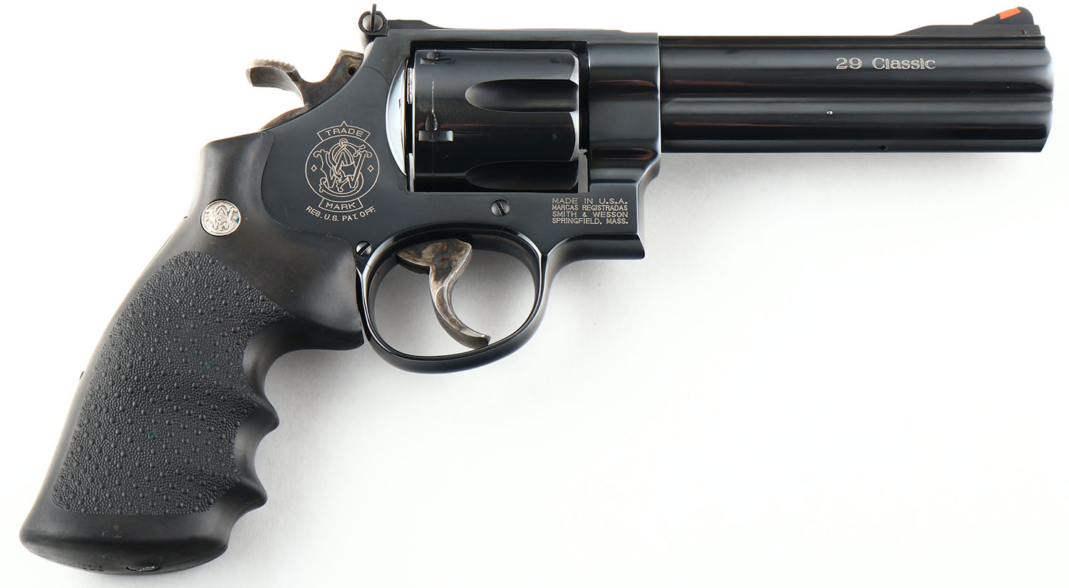 Smith & Wesson, Model 29 Classic (29-5), CAL: 44 MAG, MFG: Modern, SN: TJB3519, Double Action Revolver, 5'' barrel. The leftr side of the barrel is marked ''SMITH & WESSON'' & ''44 MAGNUM''. The right side of the barrel is marked ''29 CLASSIC''. The right side of the frame is marked with the standard four line address stamp & a large S&W trademark logo. The original stipped Hogue rubber grips with S&W medallions are excellent. The original metal blue finish rates 98% overall. Bore is excellent. Adjustable rear sight & elevated serrated blade front sight with orange insert. Comes with an unmarked custom leather holster. FFL Req. - Value: 700 to 1000