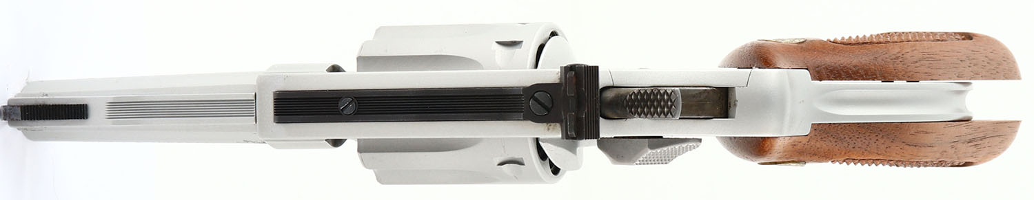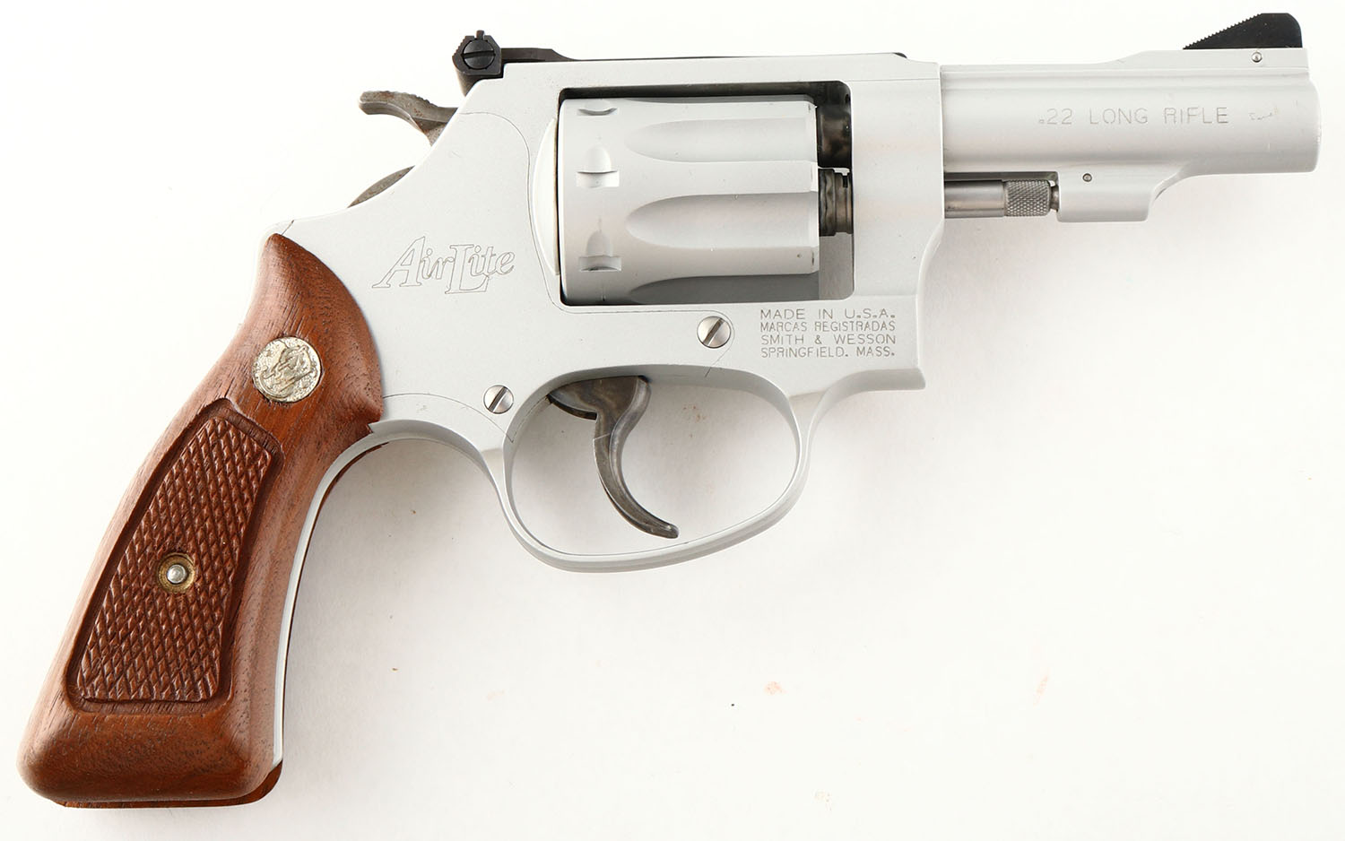 Smith & Wesson, Model 317-1, CAL: 22LR, MFG: Modern, SN: CCJ7154, Double Action Revolver, 2 7/8'' barrel. The replacement S&W medallion checkered wood grips are excellent. The matte silver finish is very good, with scrapes concentrated to the left side of the barrel & cylinder. Bore is excellent. Adjustable rear sight & elevated blade front sight. Comes with original checkered rubber grips. FFL Req. - Value: 400 to 600