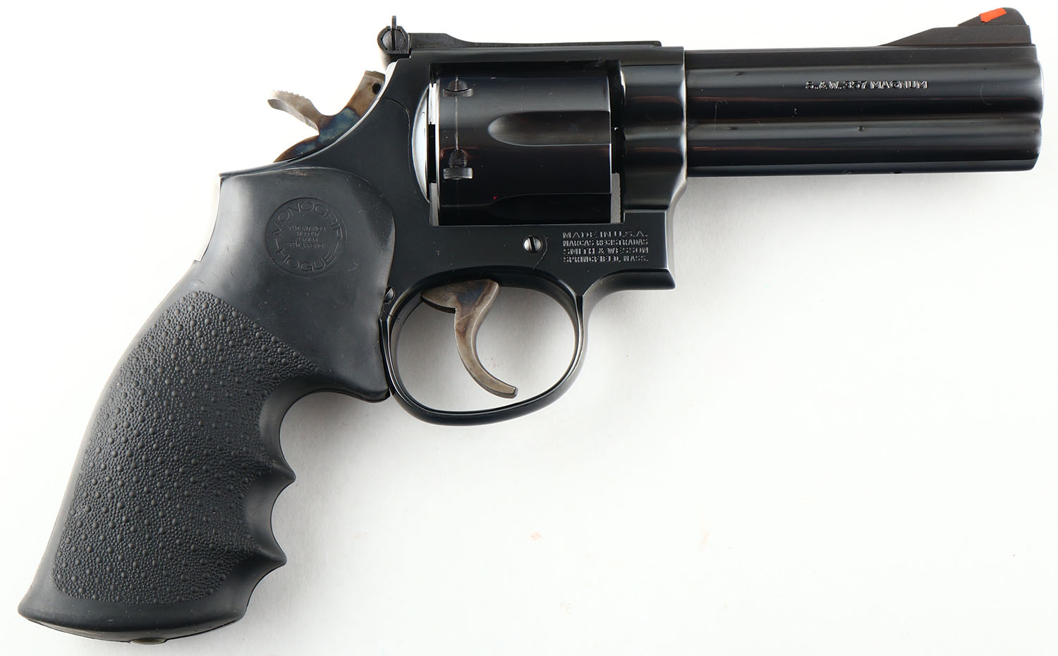 Smith & Wesson, Model 586, CAL: 357 MAG, MFG: 1981-85, SN: AAF1000, Double Action Revolver, 4'' barrel. The Hogue Monogrip stippled rubber grips are excellent. The original metal blue finish rates 97% on the barrel & 98% on the frame. The trigger & hammer retain excellent case-colors. Bore is excellent. Adjustable rear sight & elevated serrated blade front sight. Comes with a unmarked leather holster. FFL Req. - Value: 550 to 950